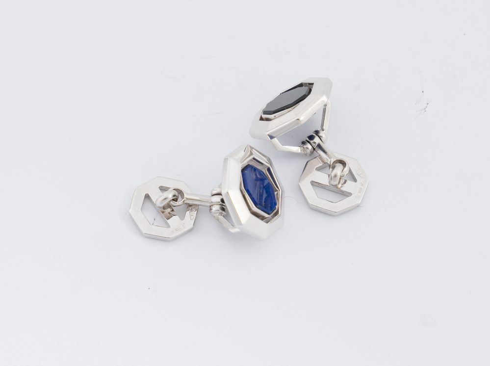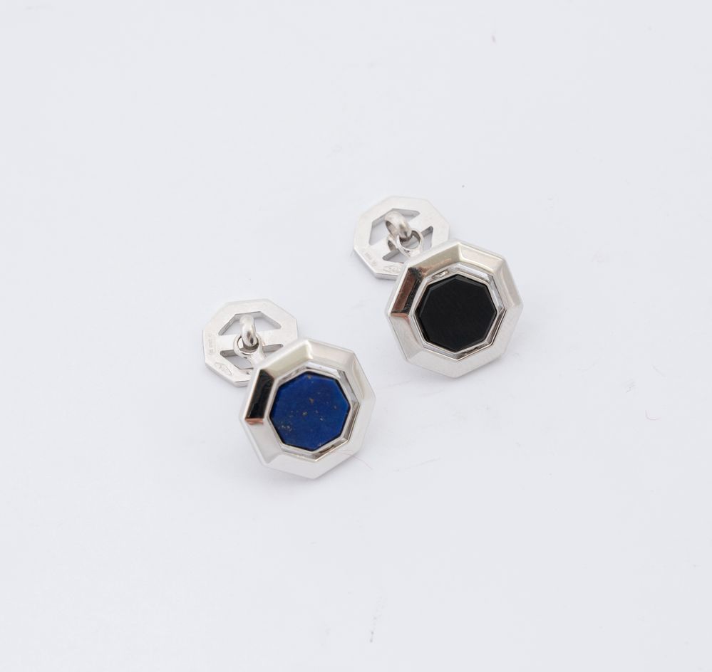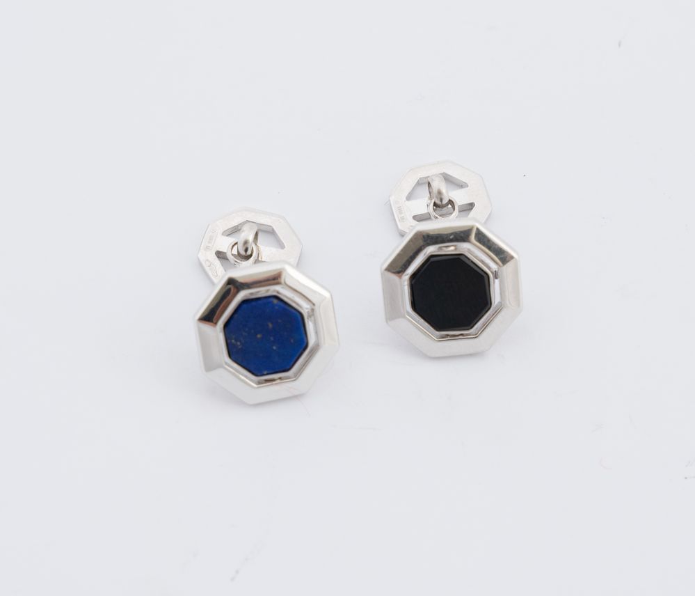 Paio di gemelli in oro bianco 18K, marcati “BAKARA’”, ciascuno sagomato a profilo ottagonale centrato da elemento basculante double-face decorato con onice e lapislazzuli. Peso complessivo 11,2 grammi.