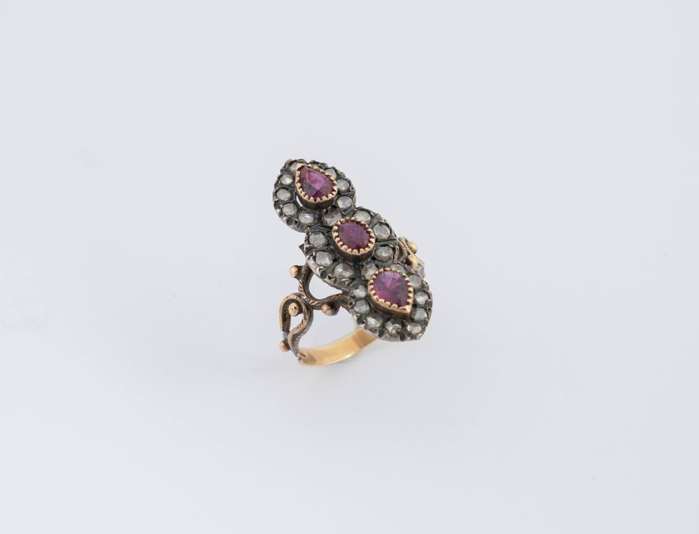 Anello realizzato in oro e argento, seguendo un disegno a navette allungata decorata con tre rubini entro cornice di rose di diamante. Peso complessivo 7,9 grammi.