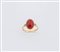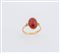 Anello in oro giallo 18K, centrato da cabochon ovale di corallo rosso mediterraneo. Peso complessivo 3,6 grammi.
