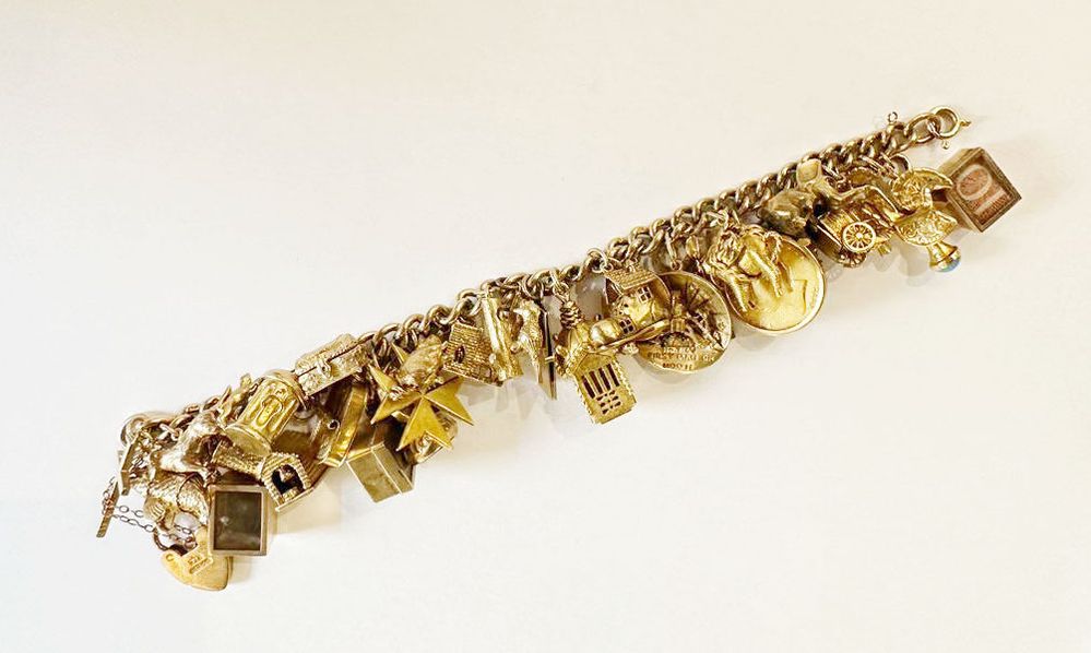 Bracciale in oro giallo 9K a catena con charms. Peso complessivo 152,20 grammi.