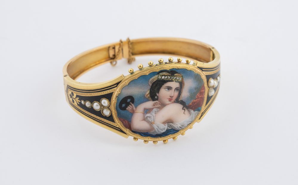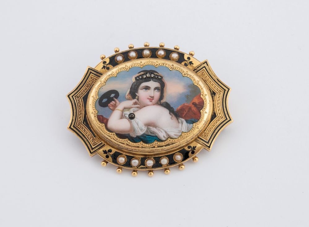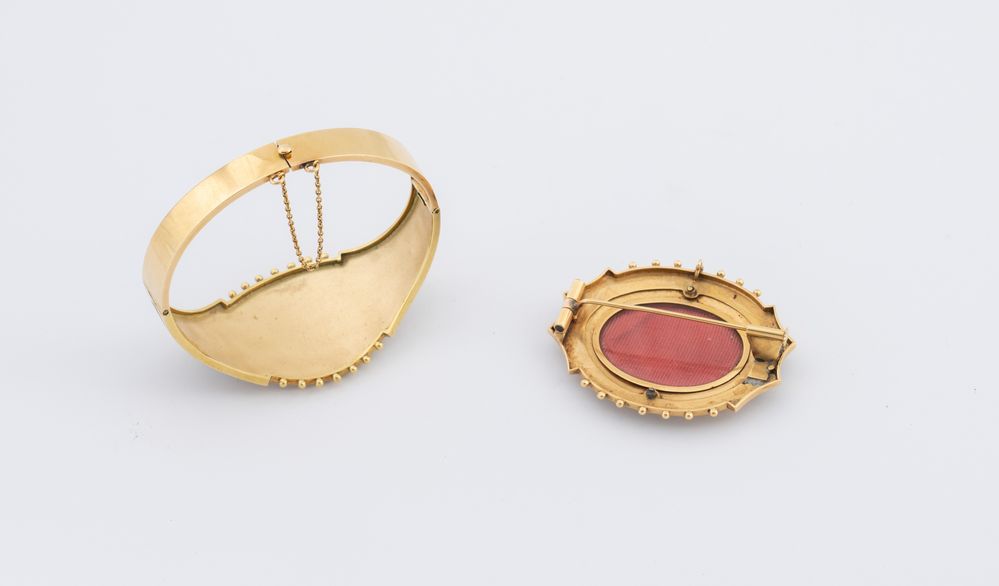 Bracciale a manetta e spilla cajolet oro giallo 18K, Epoca Borbonica, ciascuno centrato da miniatura dipinta di soggetto femminile decorata con piccole rose di diamante, microperle e smalti neri. Peso complessivo 39,5 grammi.
