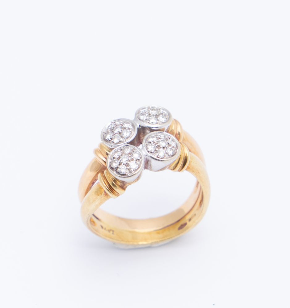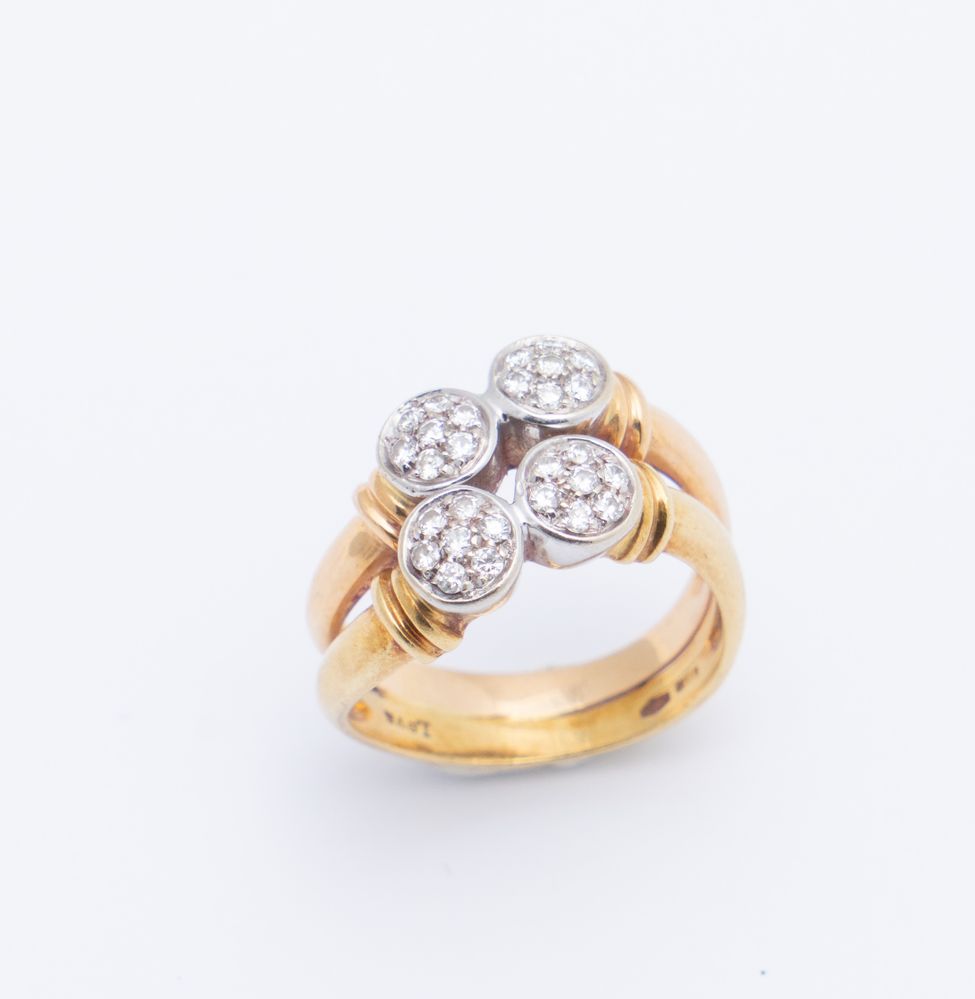 Anello in oro giallo, rosa e bianco 18K e diamanti, realizzato con gambo a forcella di linea sinuosa e centrato da quattro elementi circolari decorati a pavé di diamanti per un peso stimato di 0,40 ct. Peso complessivo 7,8 grammi.