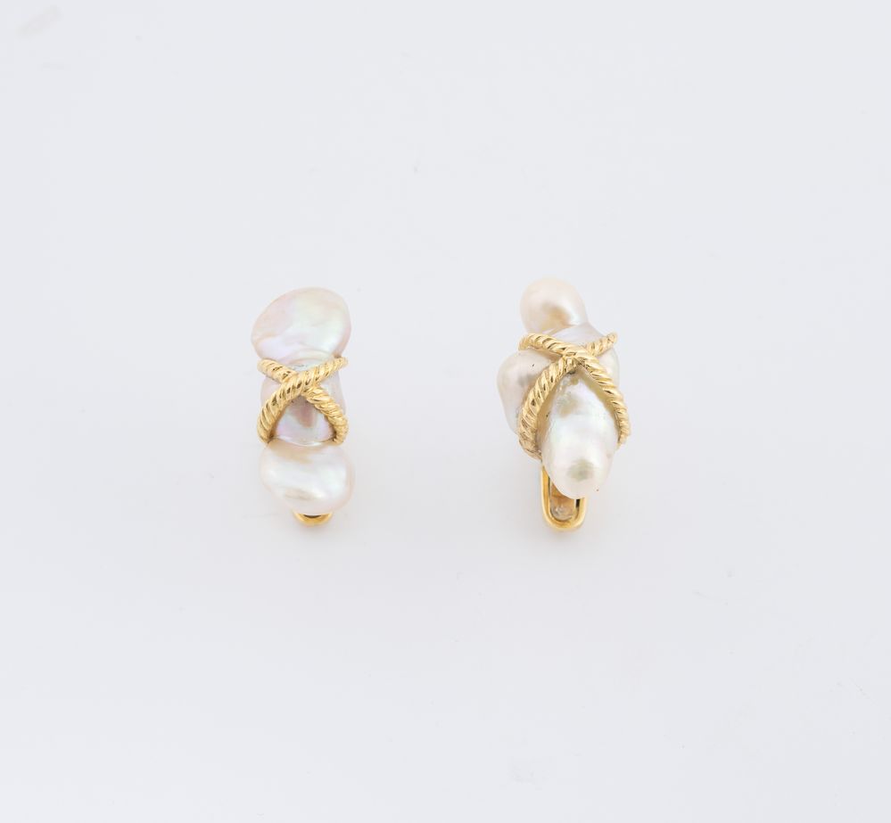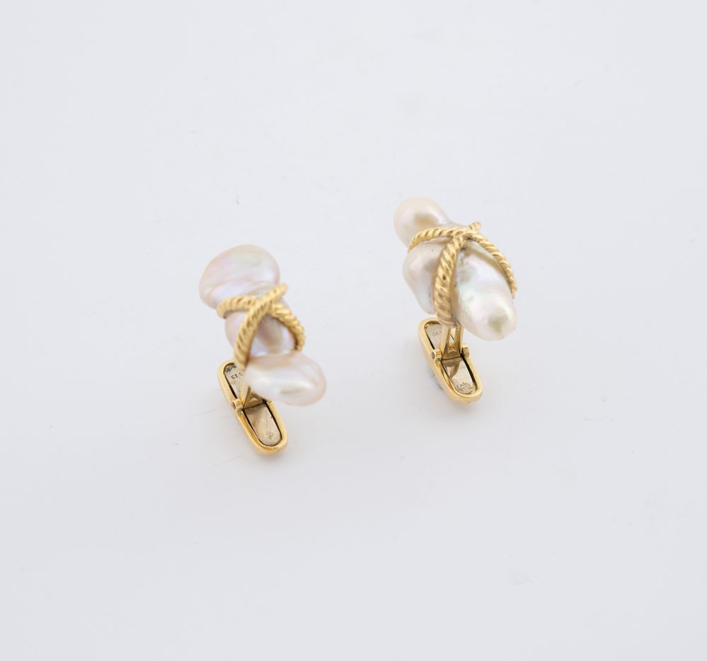 Paio di gemelli in oro giallo 18K, ciascuno realizzato con grande perla scaramazza legata da incrocio a cordonetto in oro. Peso complessivo 23,0 grammi.
