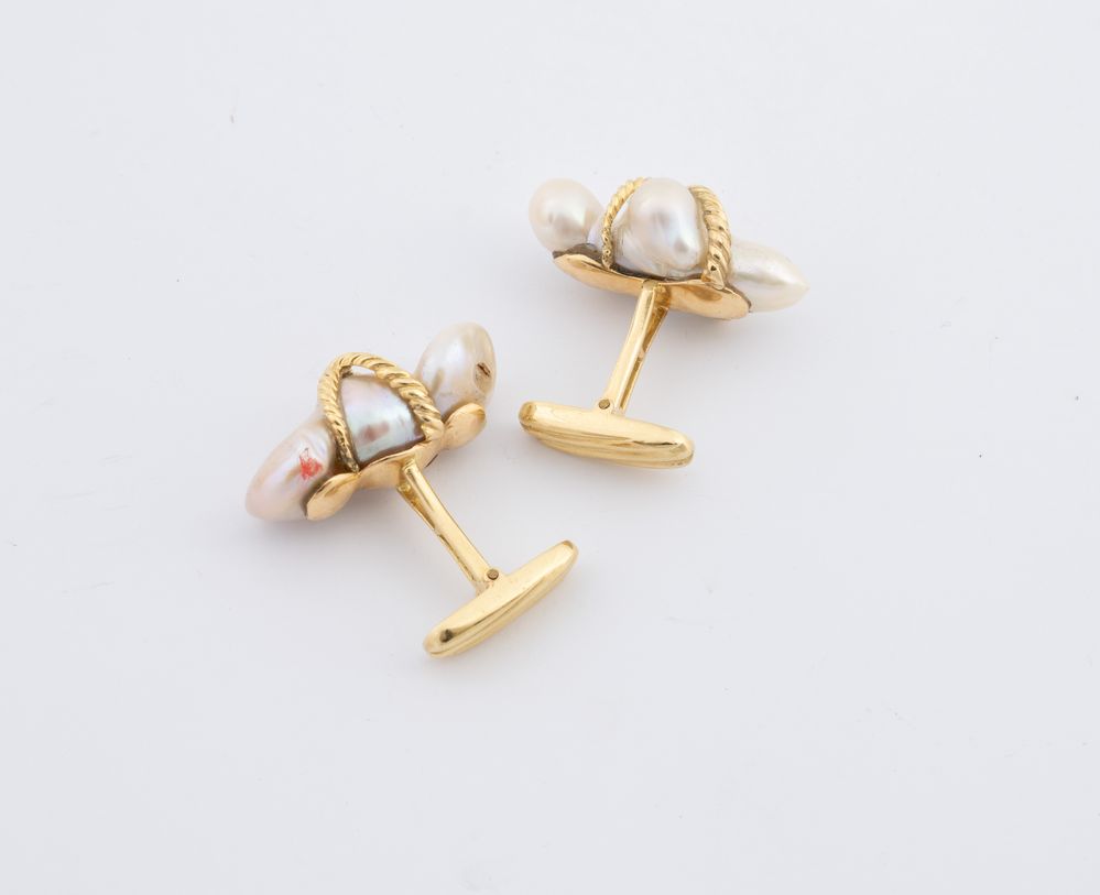 Paio di gemelli in oro giallo 18K, ciascuno realizzato con grande perla...