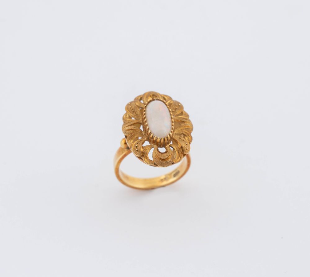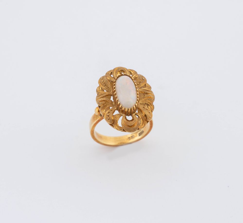Anello in oro giallo 18K inciso e traforato, centrato da cabochon ovale allungato di opale nobile australiana. Peso complessivo 10,0 grammi.