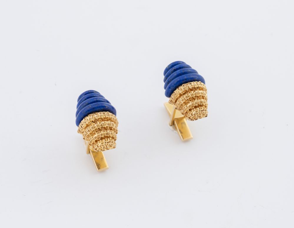 Paio di gemelli in oro giallo 18K, ciascuno realizzato con elemento oblungo costolato in oro inciso e bassorilievo in lapislazzuli. Peso complessivo 23,4 grammi.