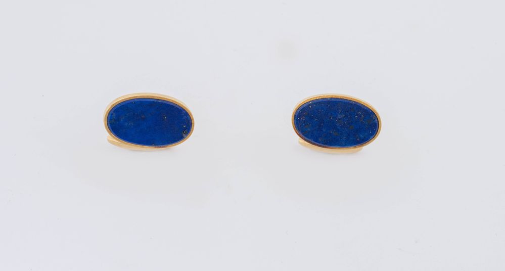 Paio di gemelli in oro giallo 18K, ciascuno realizzato con formella ovale in lapislazzuli. Peso complessivo 18,4 grammi.