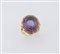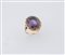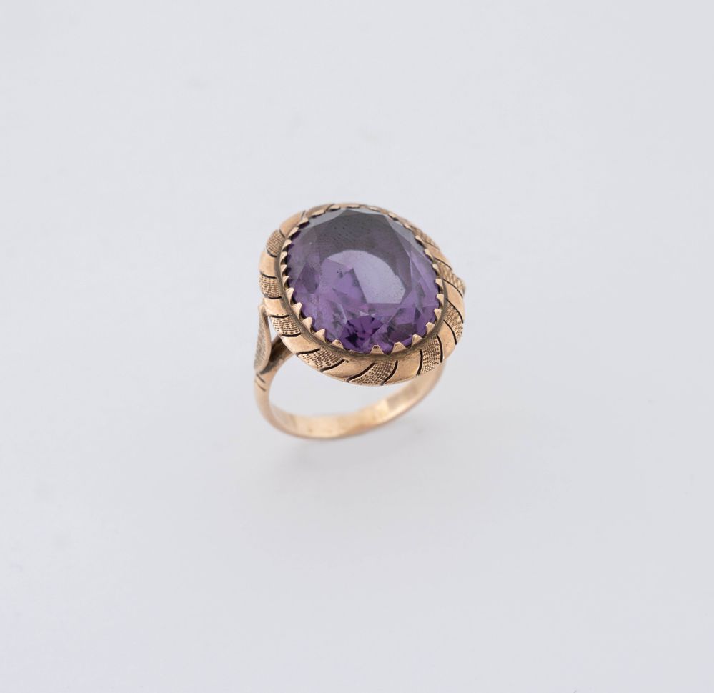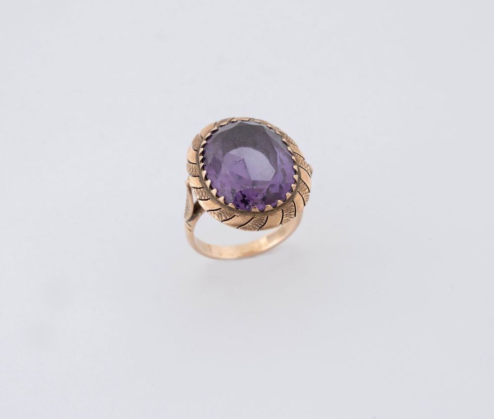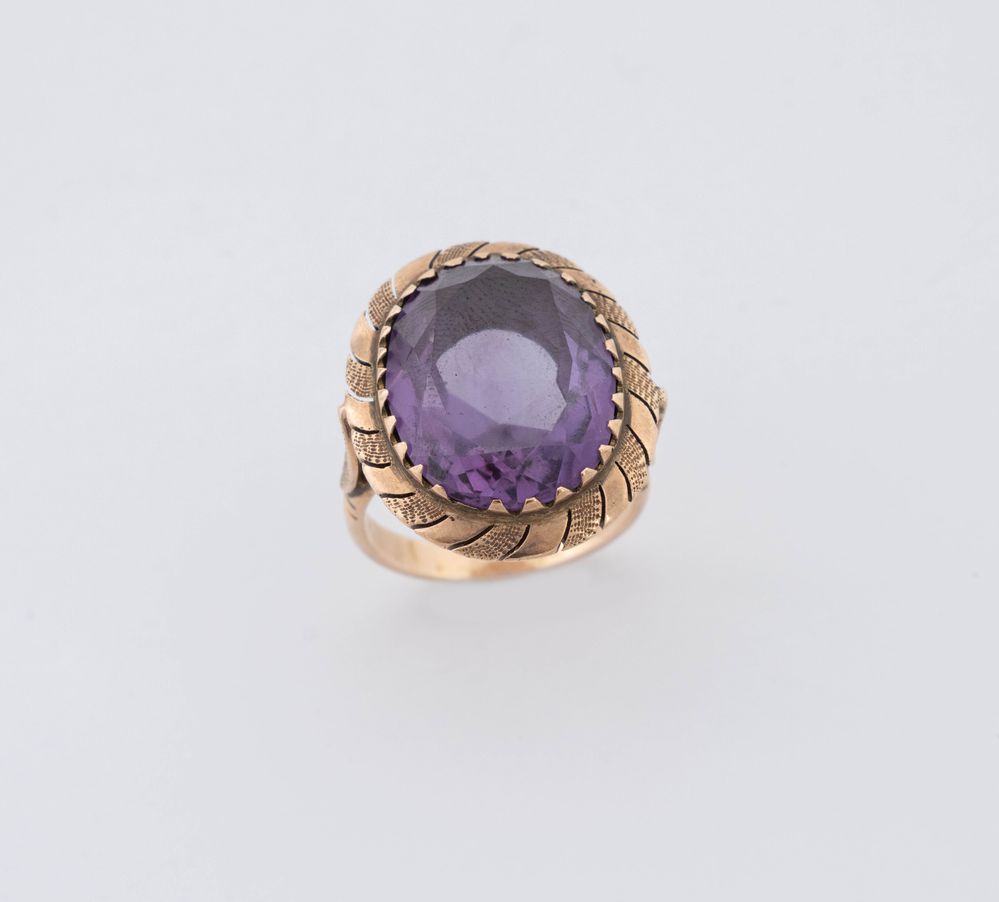 Anello in oro rosa 14K, centrato da grande gemma sintetica ovale sfaccettata ad imitazione dell’alessandrite. Peso complessivo 10,2 grammi.