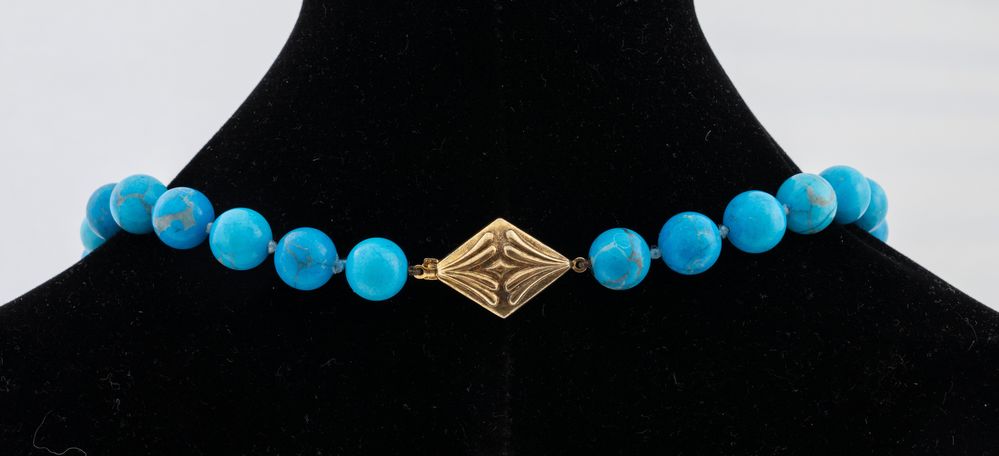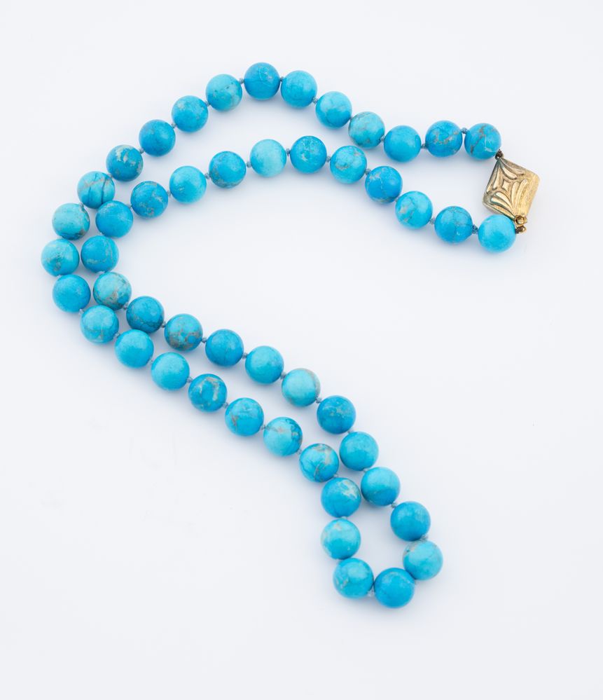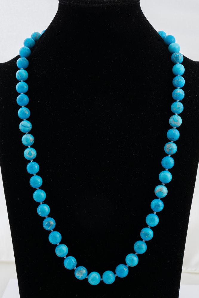 Collana in pietra dura ad una fila di sfere in pietra dura azzurra ad imitazione della turchese, lunghezza 72 cm. Peso complessivo 141 grammi.