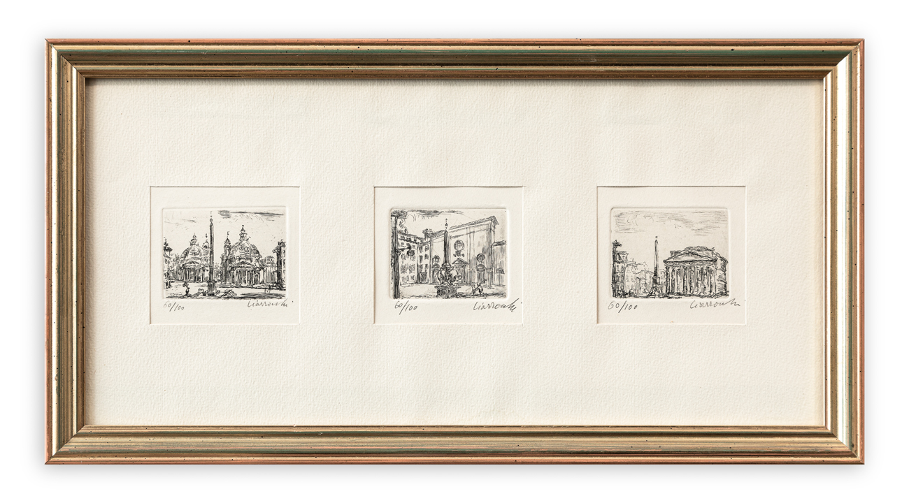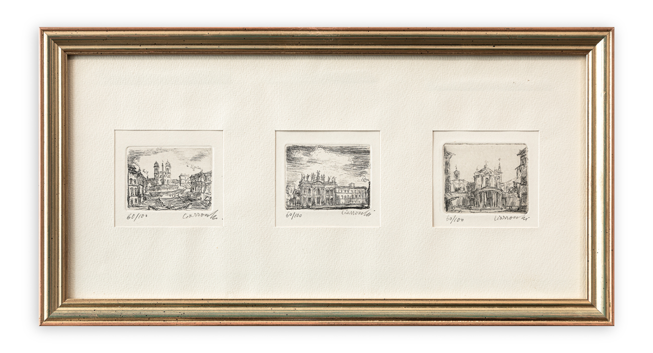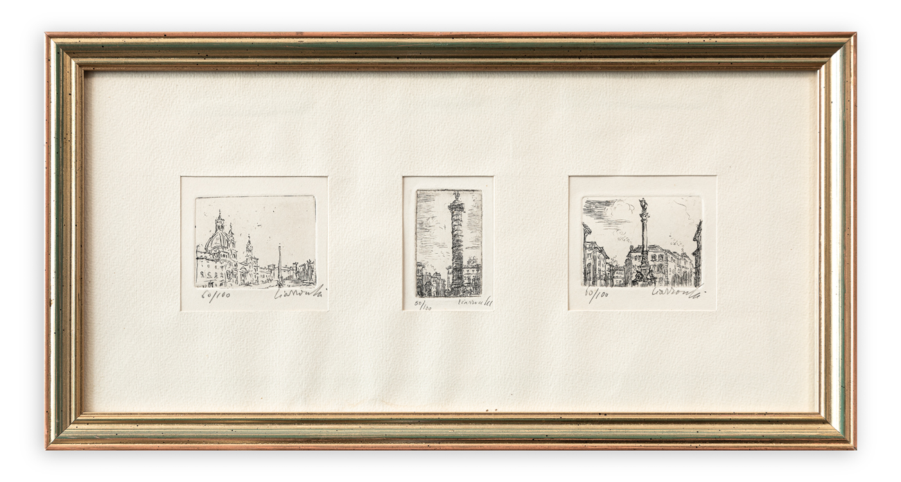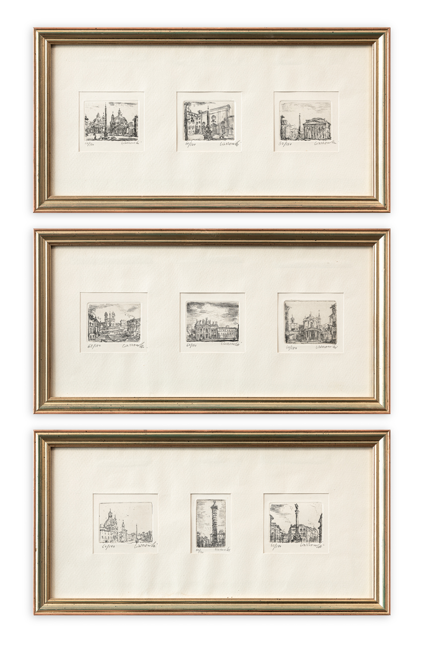 Lotto unico composto da 9 acquaforti raffiguranti visioni di Roma, ciascuna recante firma e numerazione (Esemplare 60/100) a matita al fronte
