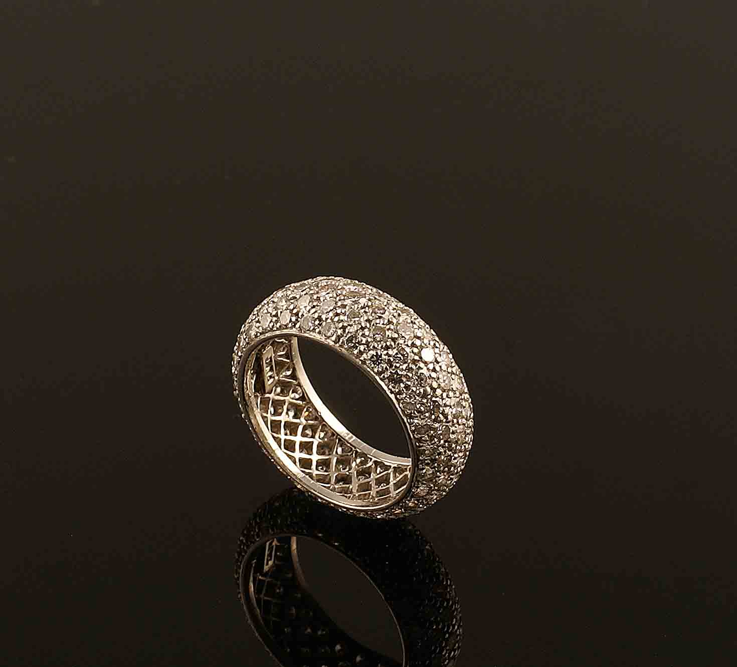 Anello a fascia bombè in platino con incastonati diamanti taglio brillante per carati 4 circa, gr. 8,7.