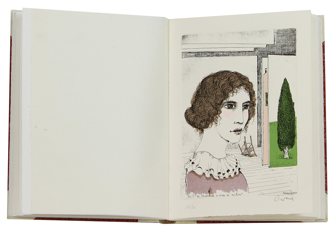 Artisti Vari Pirandello Luigi - Sei personaggi in cerca d'autore Volume con 5 litografie ed incisioni, cm. 31x23, es. 137/200 Edizione di complessivi 250 esemplari composti in caratteri Brembo e impressi con torchio su carta velata delle cartiere Magnani. Contiene 2 litografie e 3 incisioni a colori di Minguzzi, Cantatore, Caruso, Migneco e Cassinari tutte firmate e numerate. L'opera è mancante di 1 litografia in bianco e nero di Messina