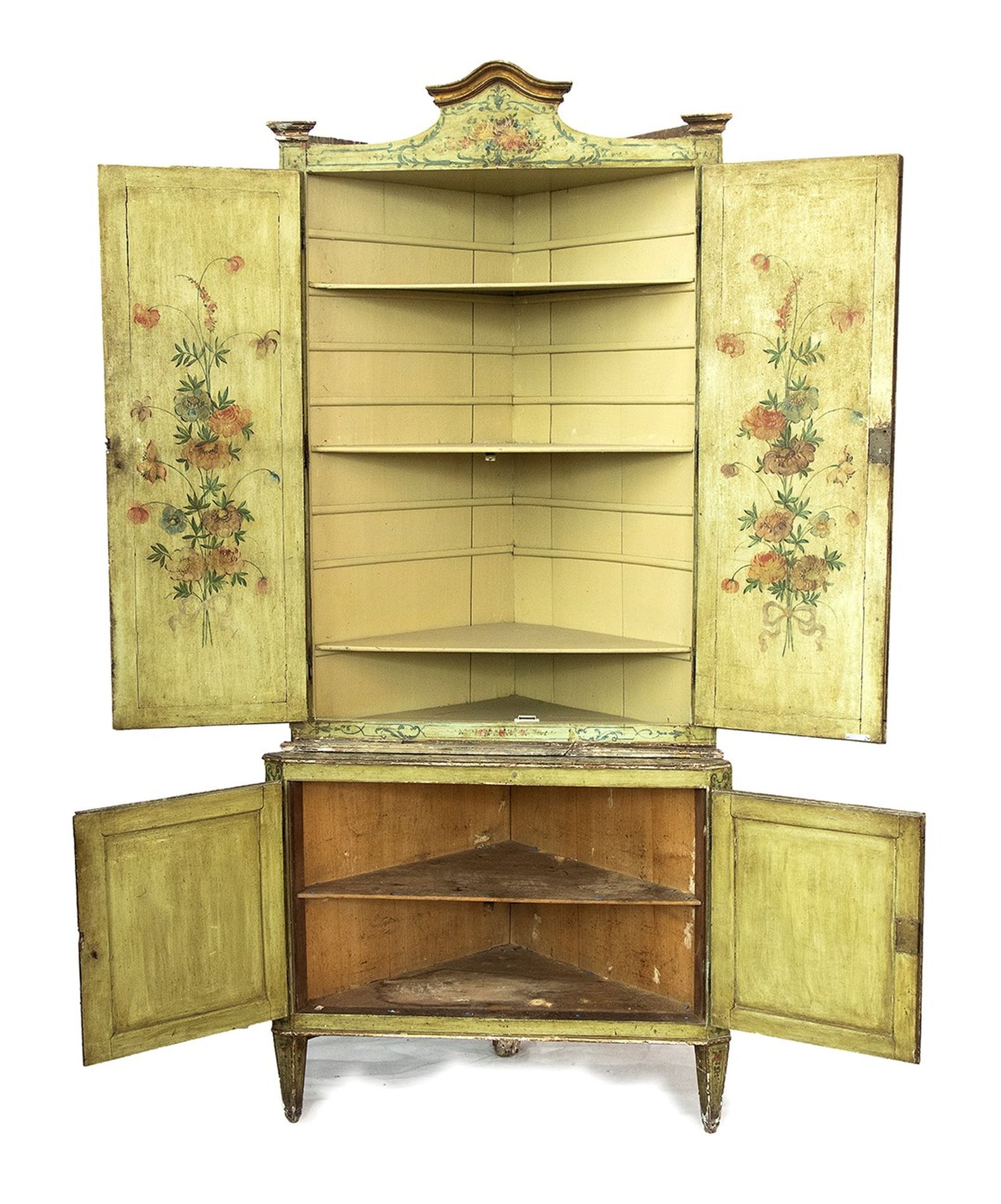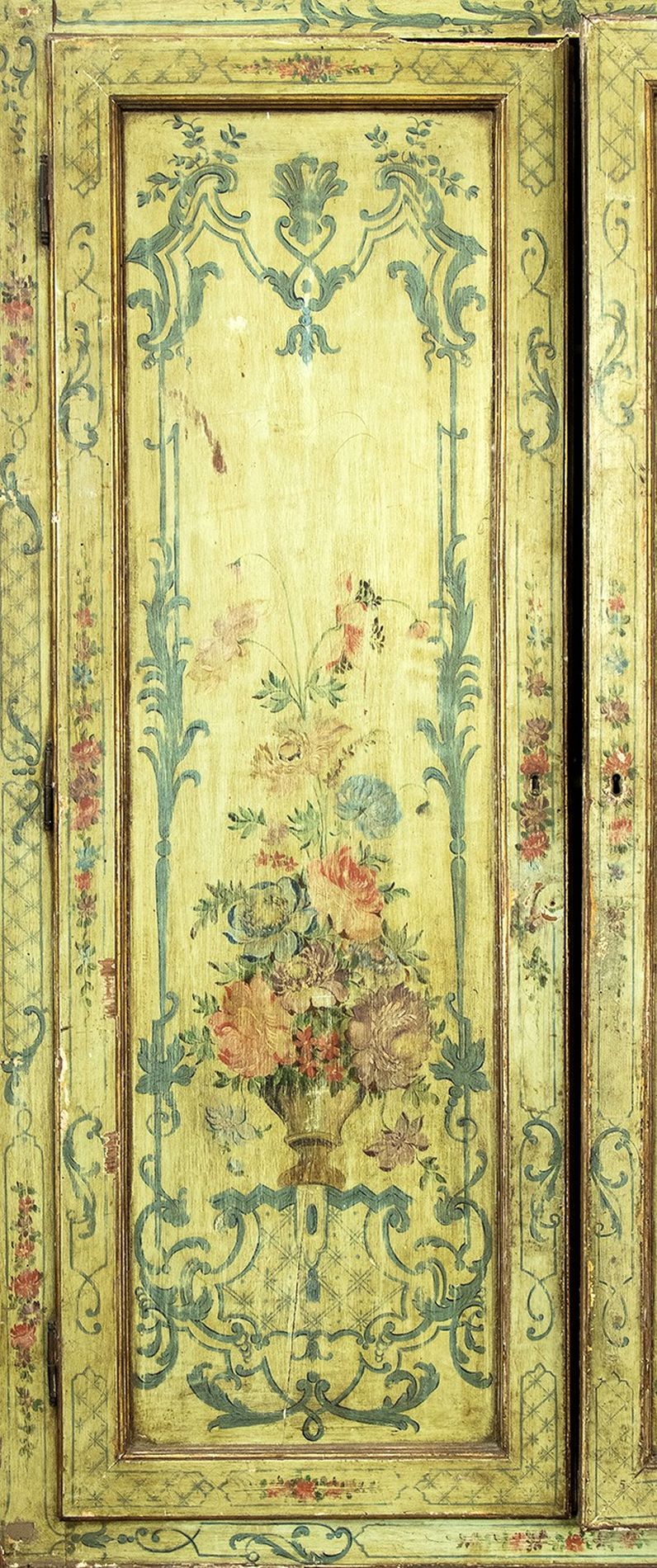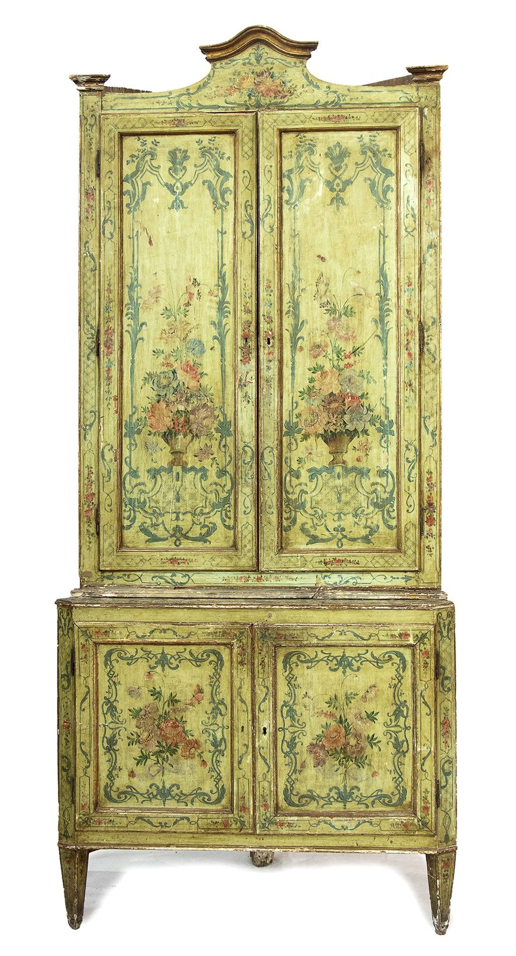 Angoliera Luigi XV laccata e dipinta - Venezia XVIII secolo ad unico corpo con piedi tronco piramidali laccati e dipinti, presenta una doppia anta nella parte superiore ed inferiore, dipinte anche all’interno completamente. Serrature coeve. Altezza x larghezza x profondità: 260 x 115 x 60 cm.