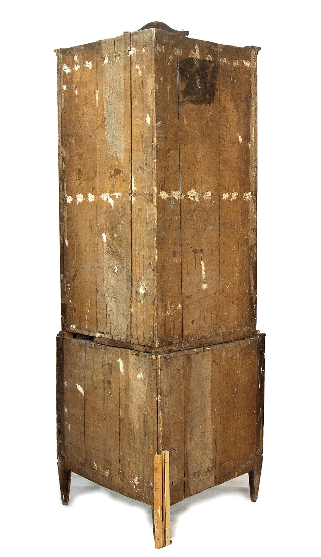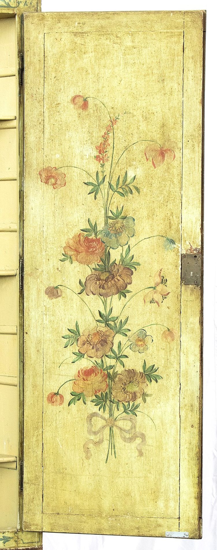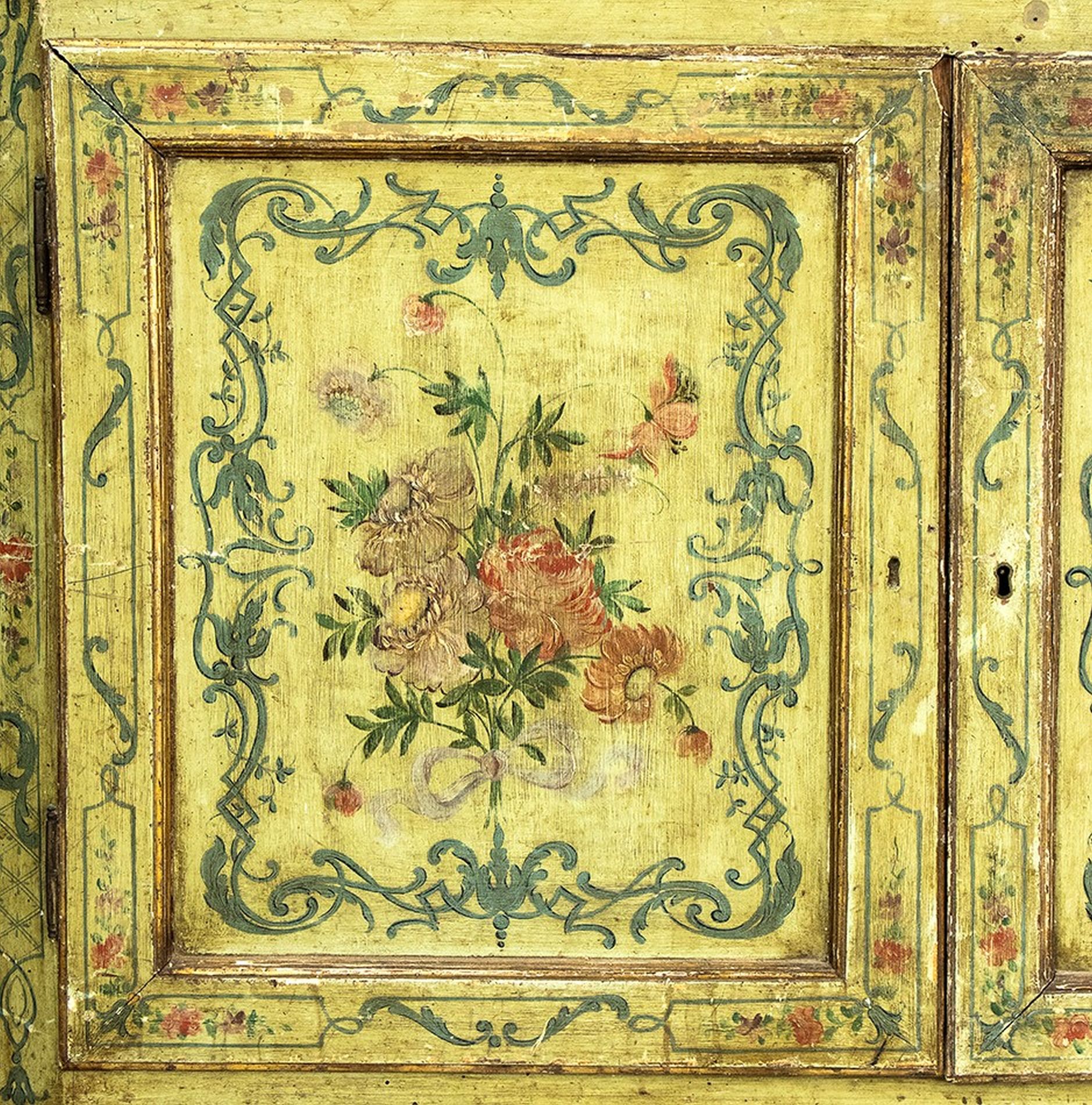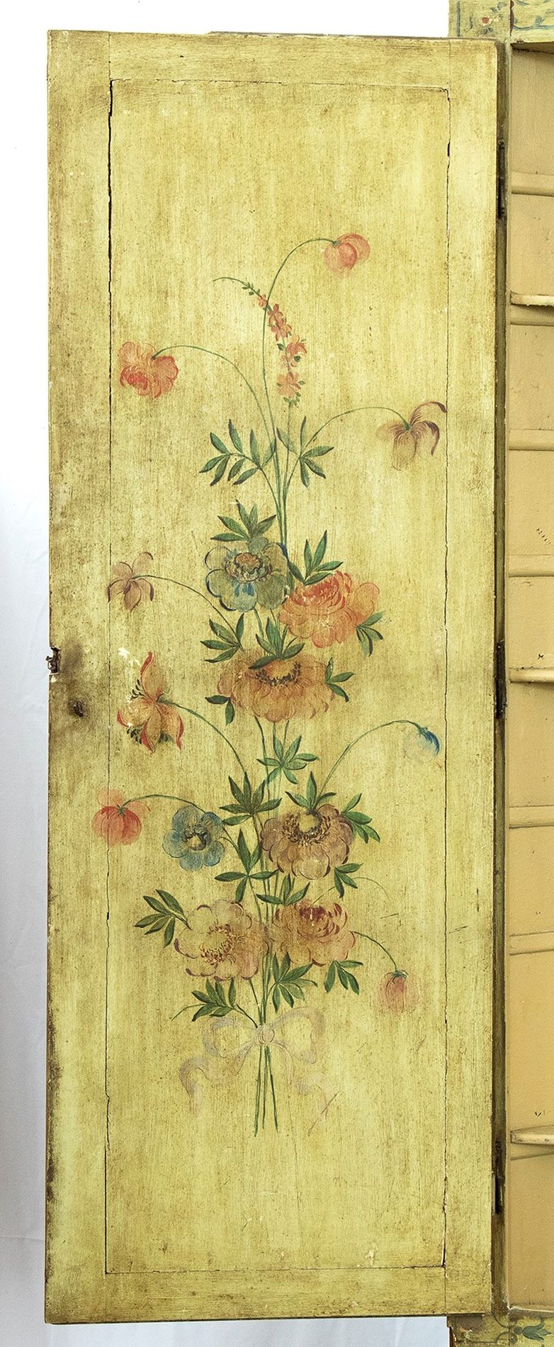 Angoliera Luigi XV laccata e dipinta - Venezia XVIII secolo ad unico corpo con piedi tronco piramidali laccati e dipinti, presenta una doppia anta nella parte superiore ed inferiore, dipinte anche all’interno completamente. Serrature coeve. Altezza x larghezza x profondità: 260 x 115 x 60 cm.