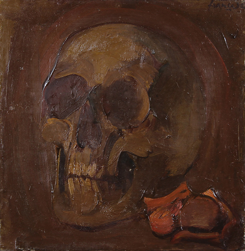 Francese Franco Teschio e orchidea secca, 1981 olio su tela, cm. 37x36...