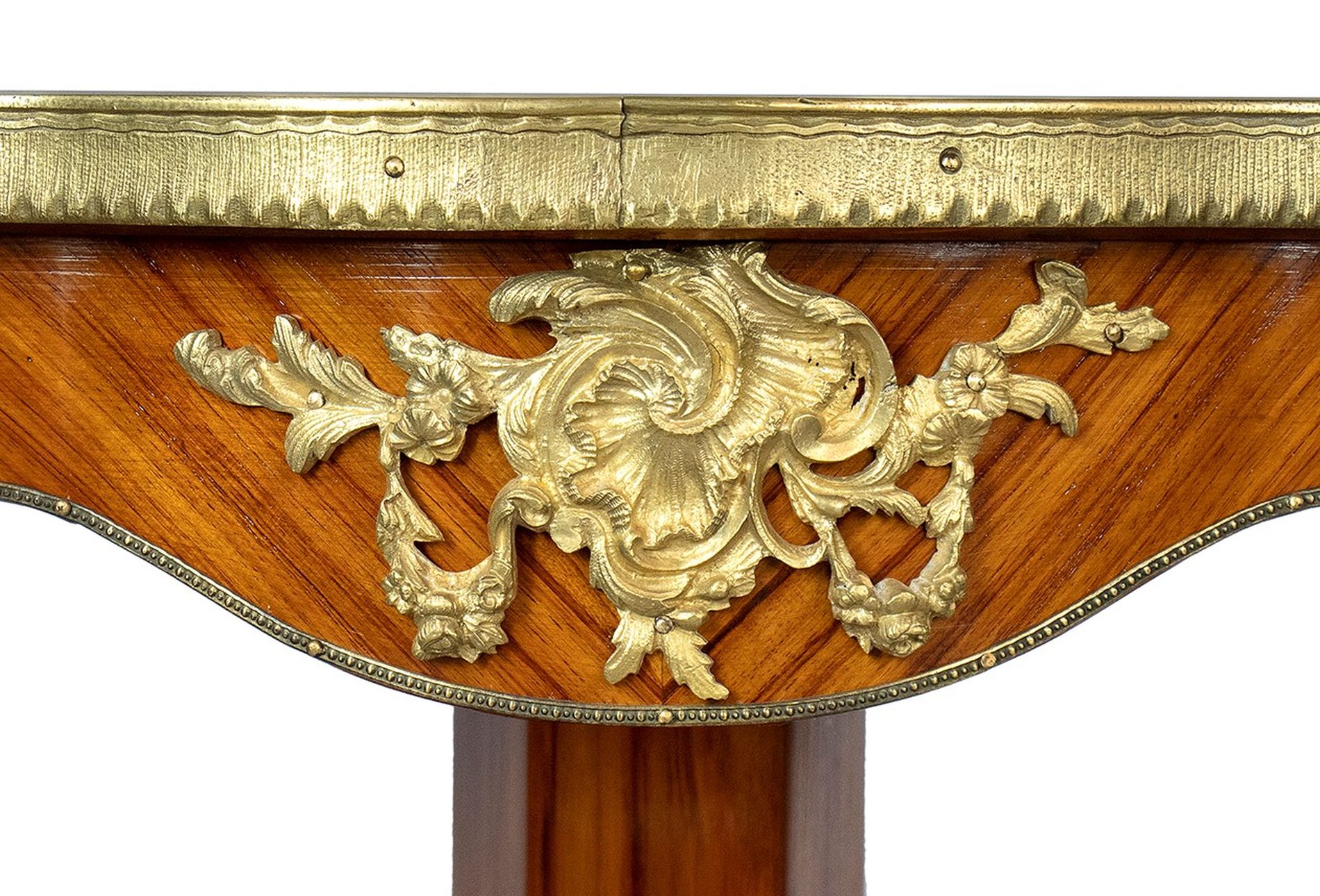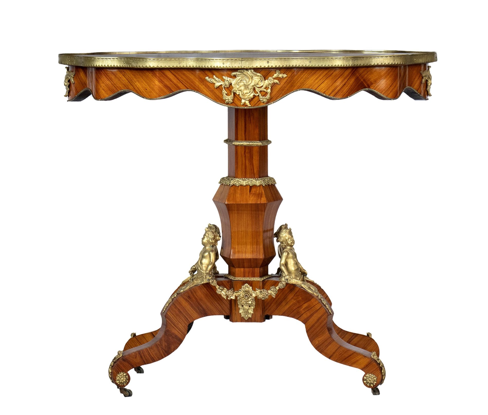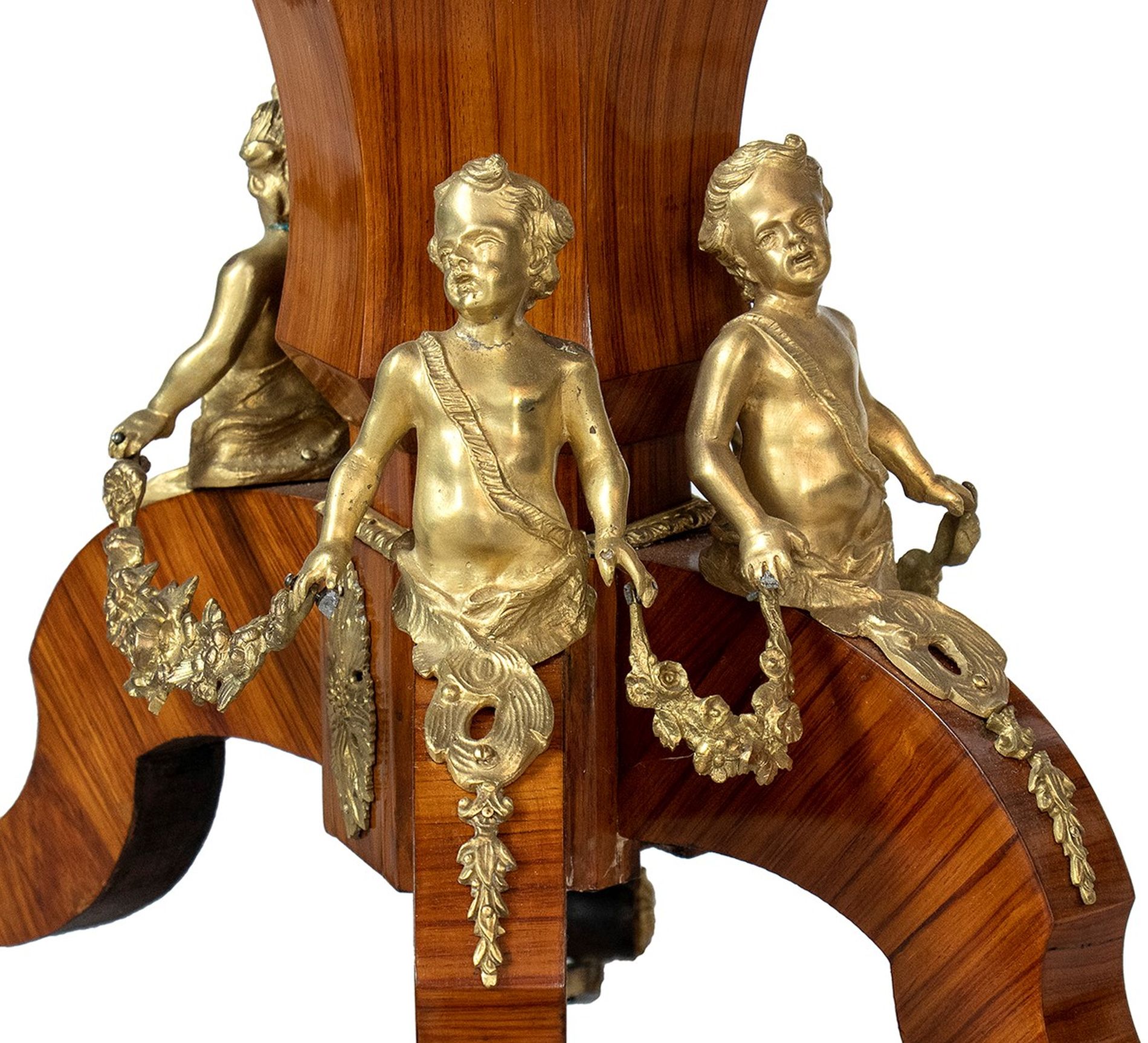 Tavolo da salotto, Napoleone III in legno ebano viola - Francia, XIX secolo basamento a gamba centrale a quattro piedi sormontati da bronzi raffiguranti busti di putto che sorreggono ghirlande collegate tra di loro, piano è contornato da una cornice in bronzo.