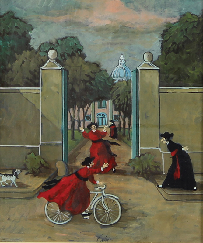 Caffè Nino In bicicletta, 1968 olio su tavola, cm. 23,4x20 firmato in basso...