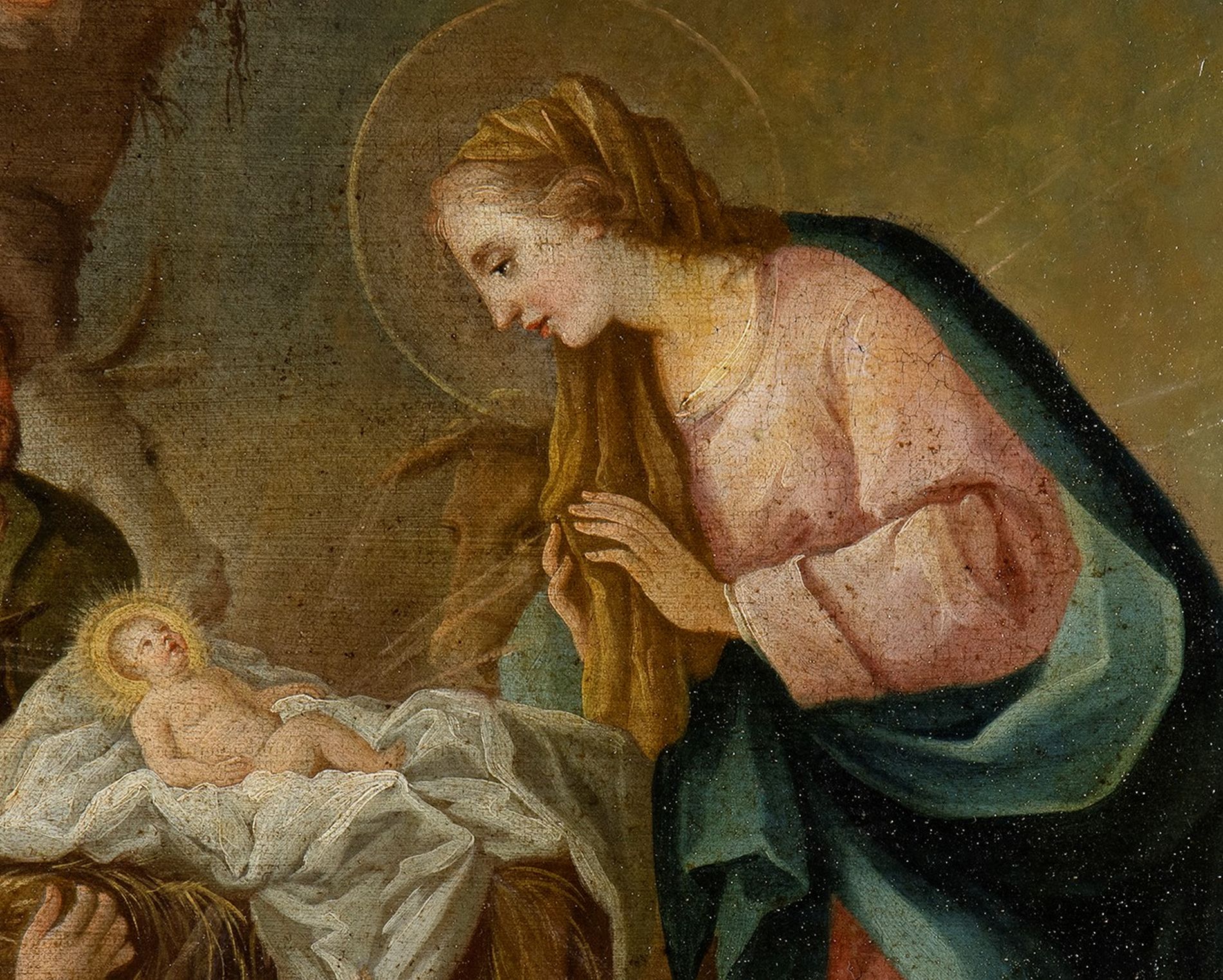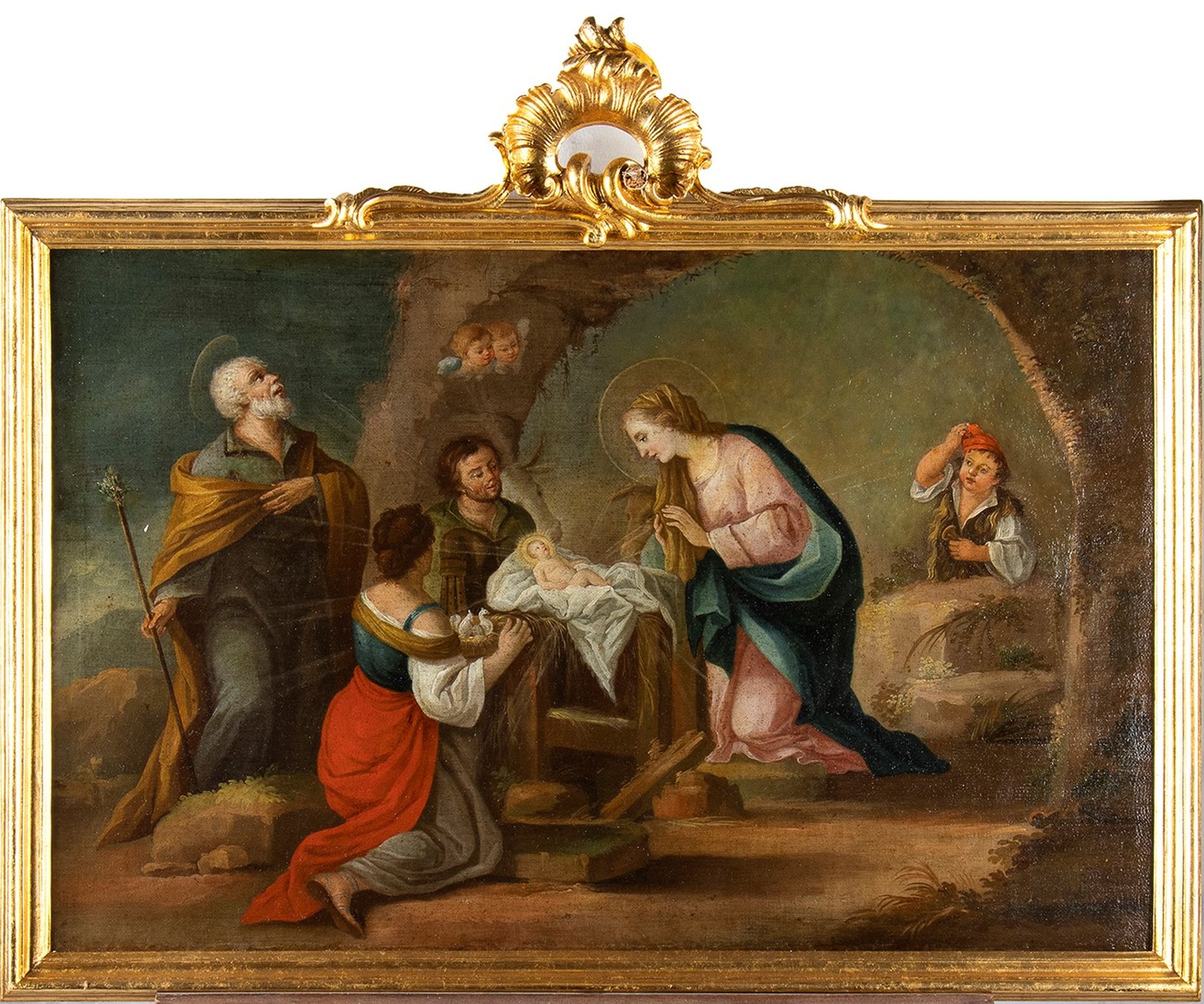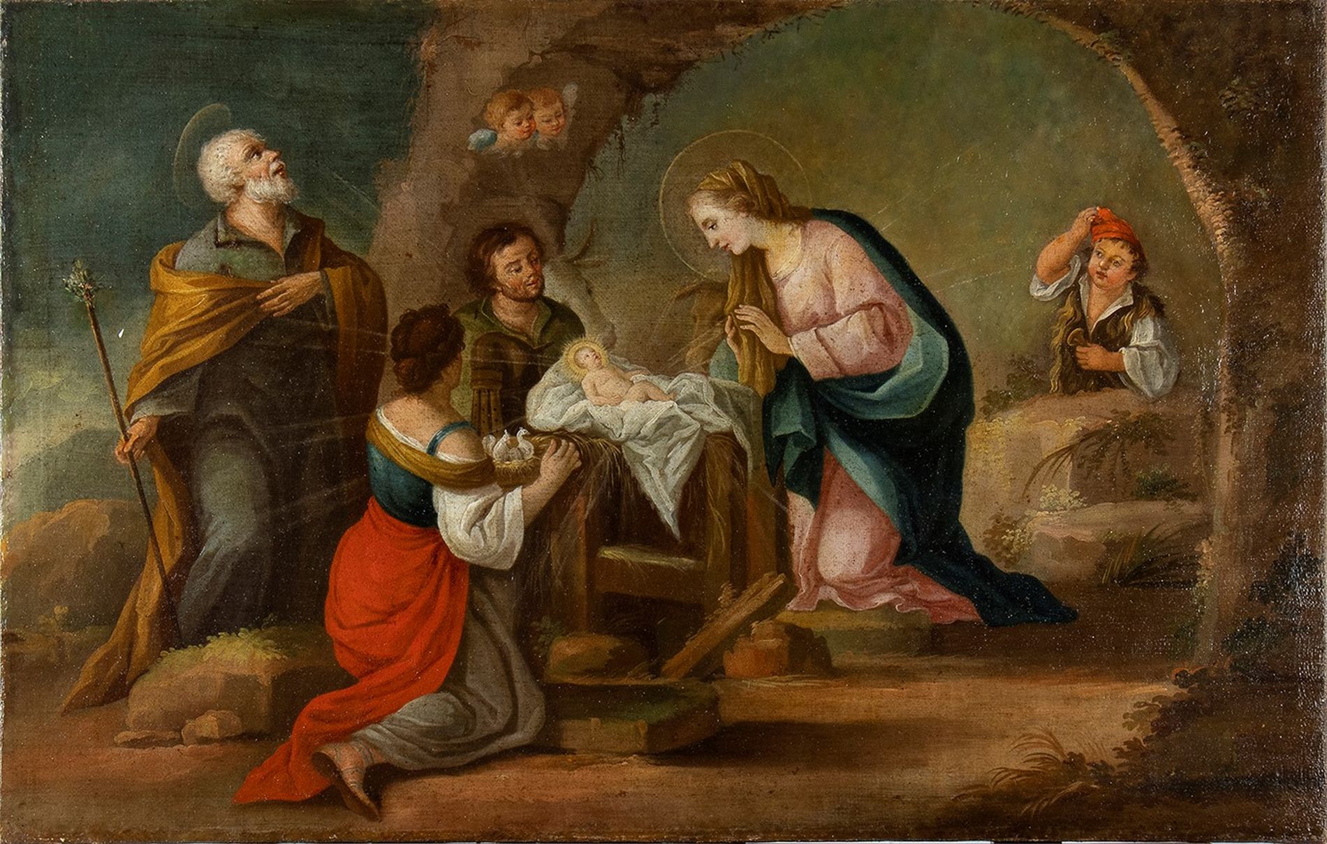 Natività - scuola napoletana del XVIII secolo olio su tela, Sacra famiglia con personaggi in adorazione.