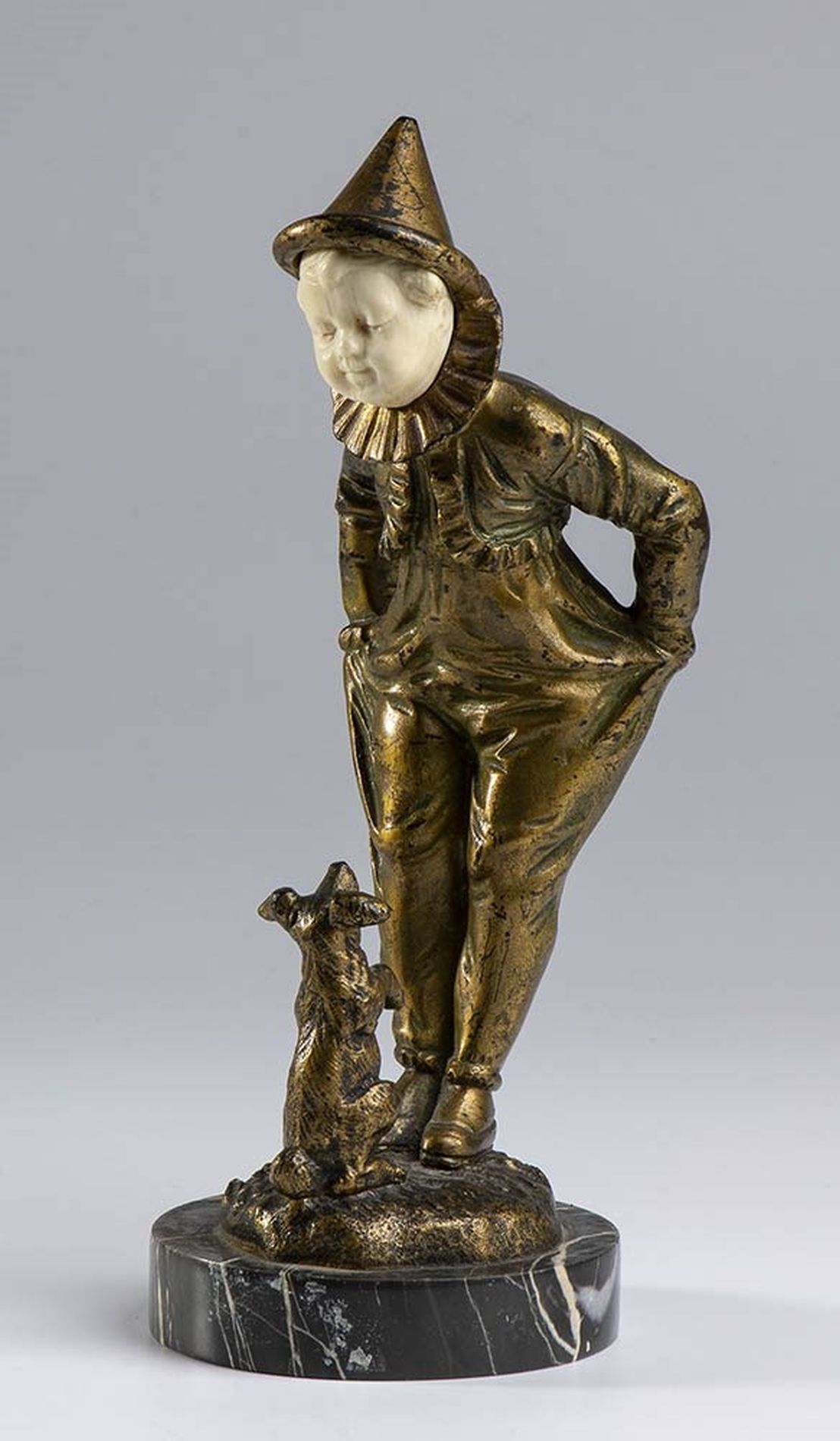 scultura criselefantina art déco raffigurante bimbo in costume e cagnolino, con viso in avorio di elefante (Loxodonta africana Blumenbach, 1797 o Elephas maximus Linnaeus, 1758). Base in marmo. Firmata sul cappello "G. OMERTH".