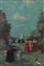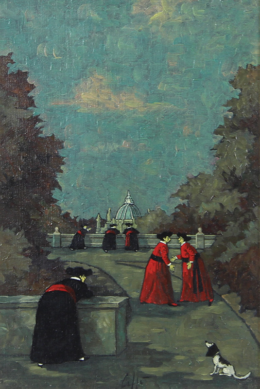 Caffè Nino Pretini e cagnolino, 1970 olio su tela, cm. 38x26 firmato in basso al centro, etichetta dell'Archivio Giorgio Borghi al retro, certificato di autenticità del dott. Giorgio Borghi su fotografia
