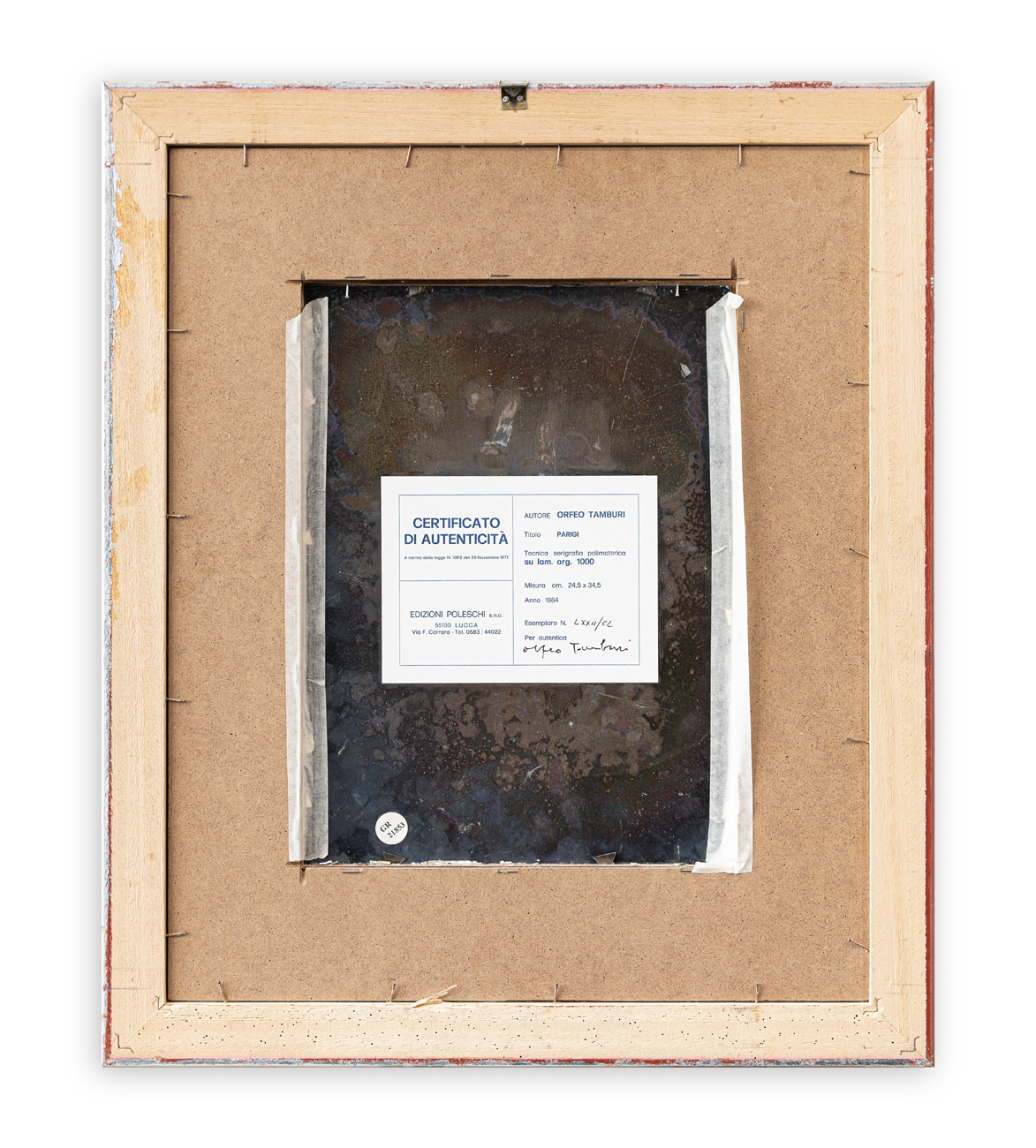 Certificato di autenticità delle Edizioni Poleschi (LU) con firma dell'Artista e numerazione (Esemplare LXXII/CL) al retro