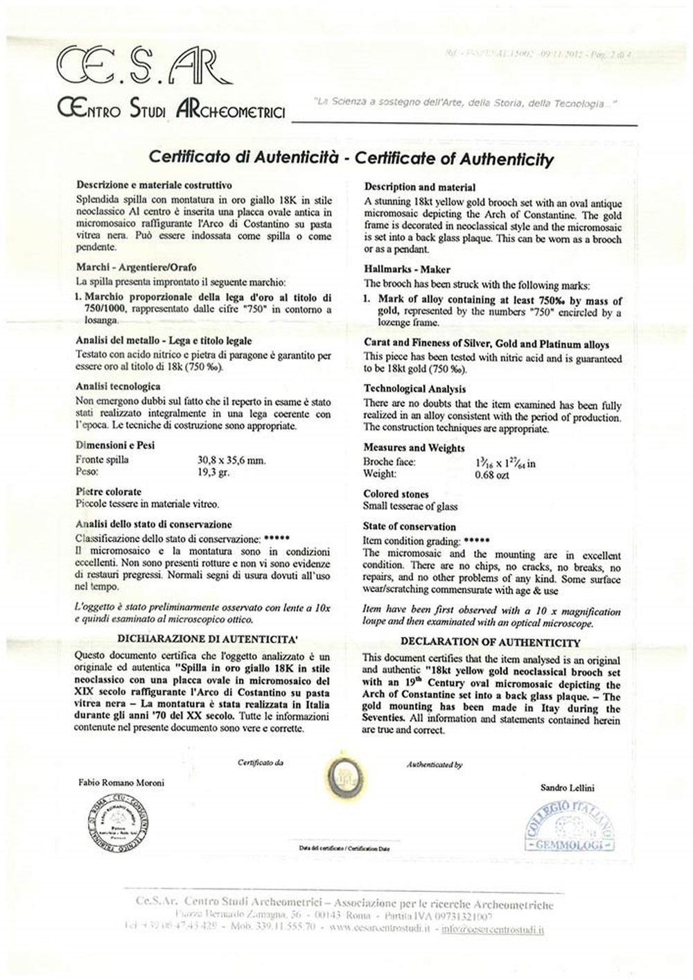 micromosaico raffigurante l'Arco di Costantino su pasta vitrea nera. Montatura successiva in oro 18k punzonata 750.