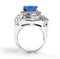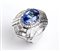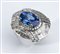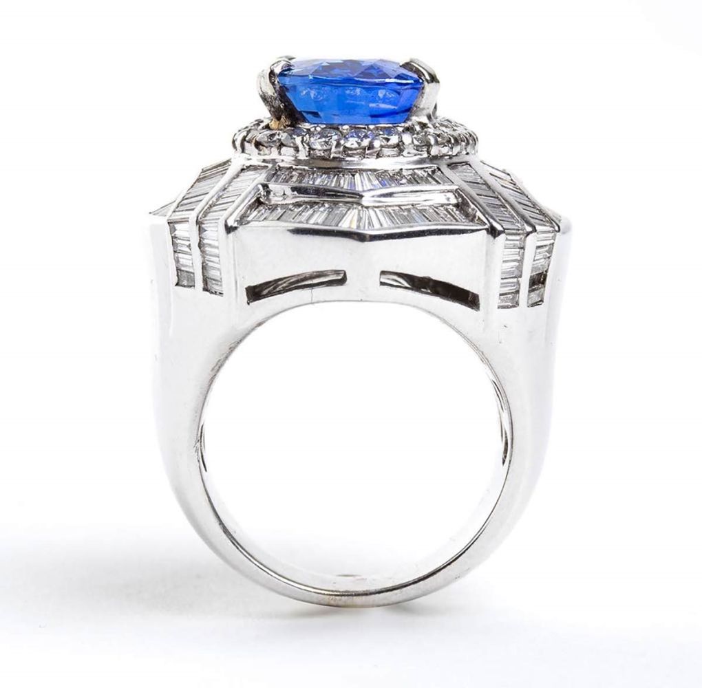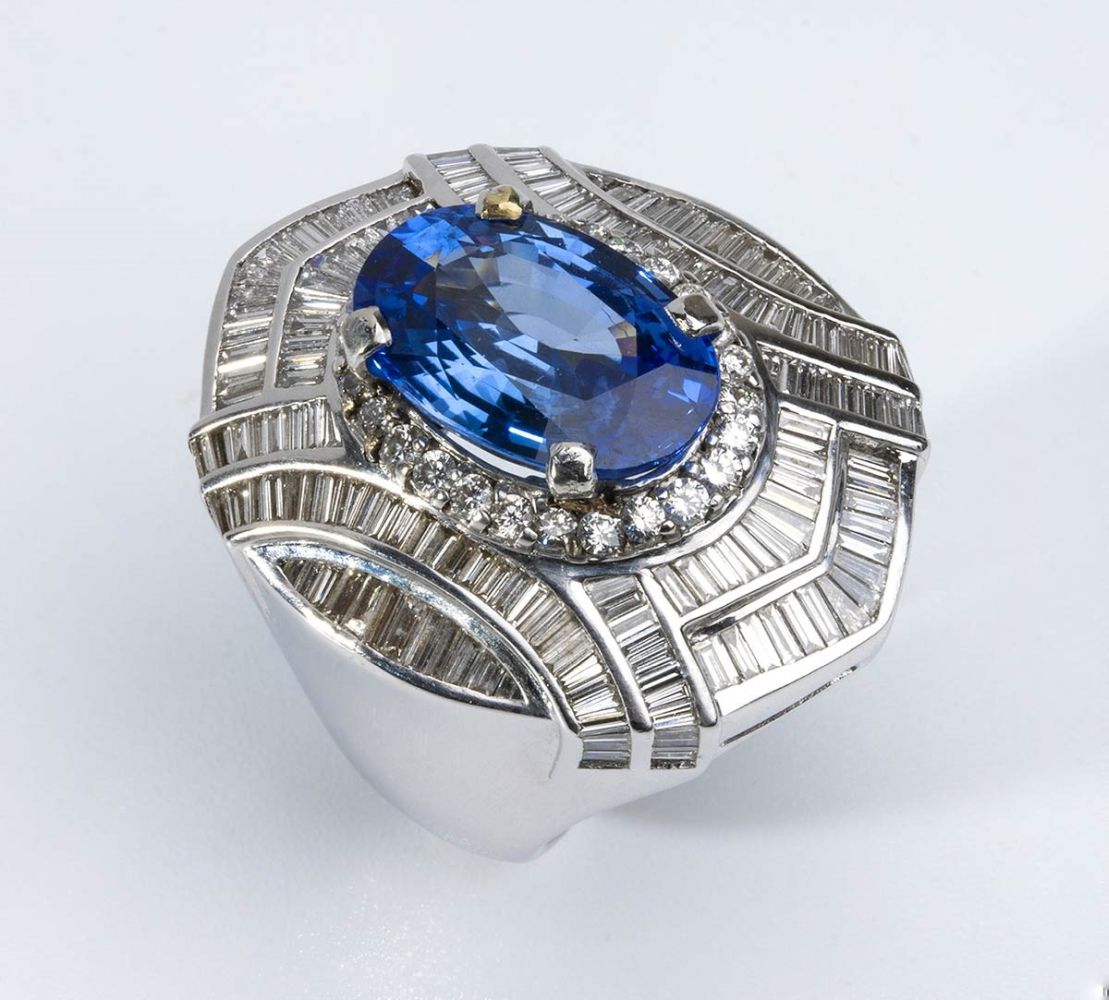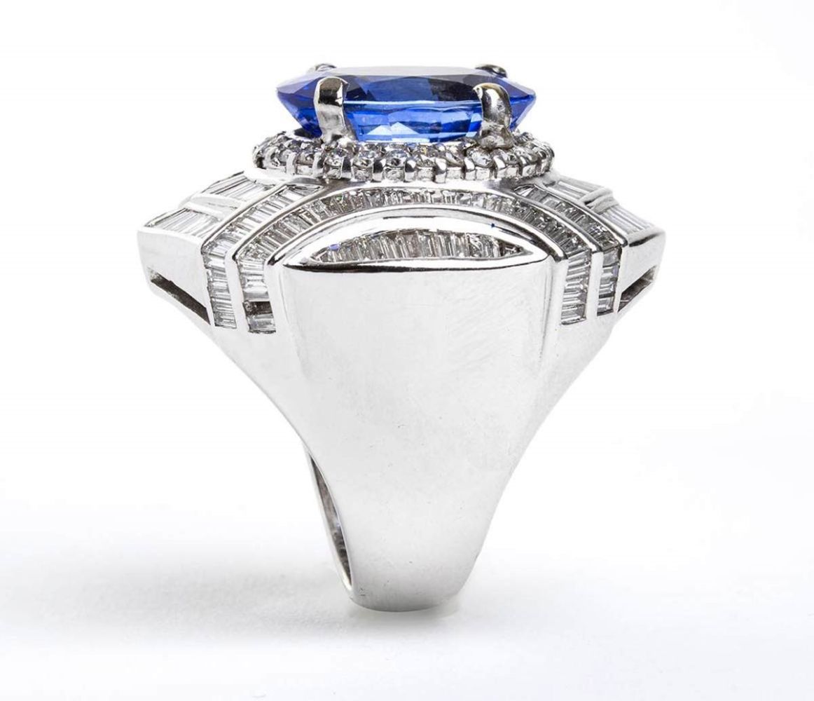 oro bianco 18k, incastonato con zaffiro ovale 9,63 ct circa incorniciato da diamanti rotondi taglio brillante, da nastri in diamanti taglio baguette e taglio tapered 6,63 ct circa, E-F, VVS-VS. Punzonato "750".