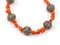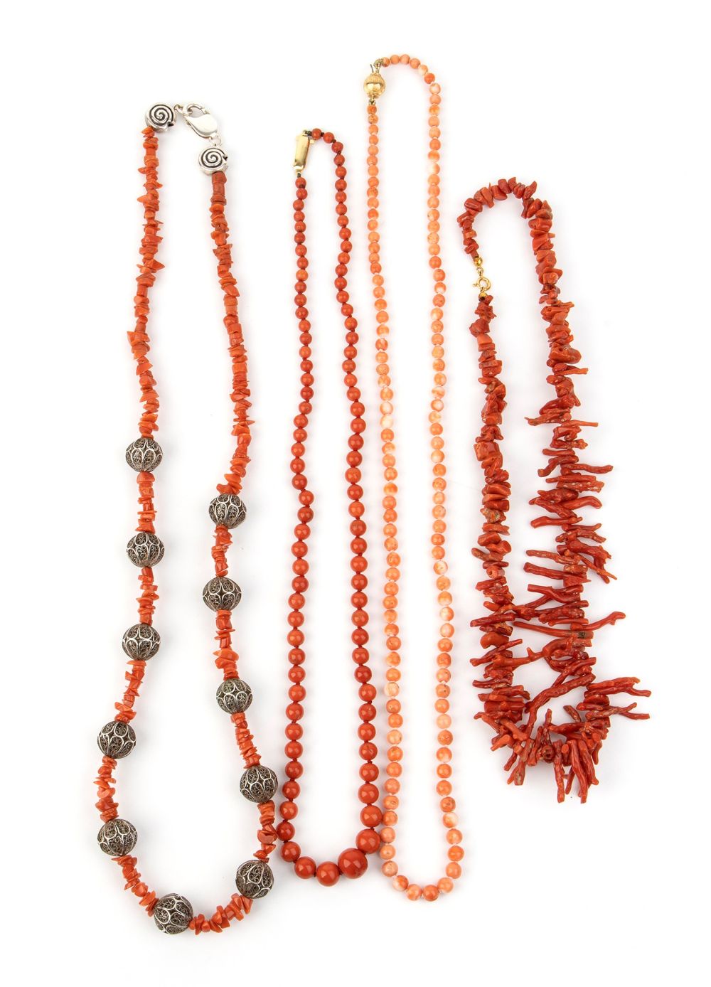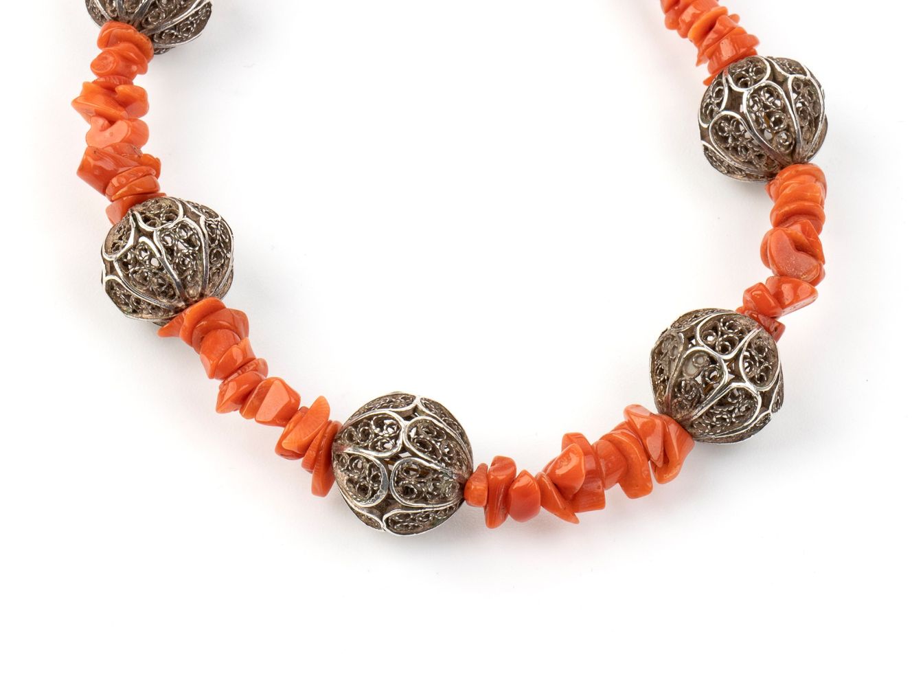 4) collana ad un filo di ciottoli di corallo Mediterraneo (corallium rubrum), interrotto da elementi a sfera traforata in argento. Punzonata "925". Lunghezza 66 cm. Peso 50.8 gr.