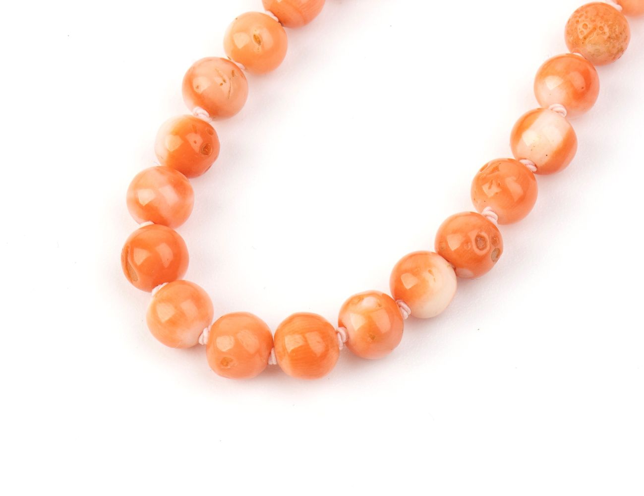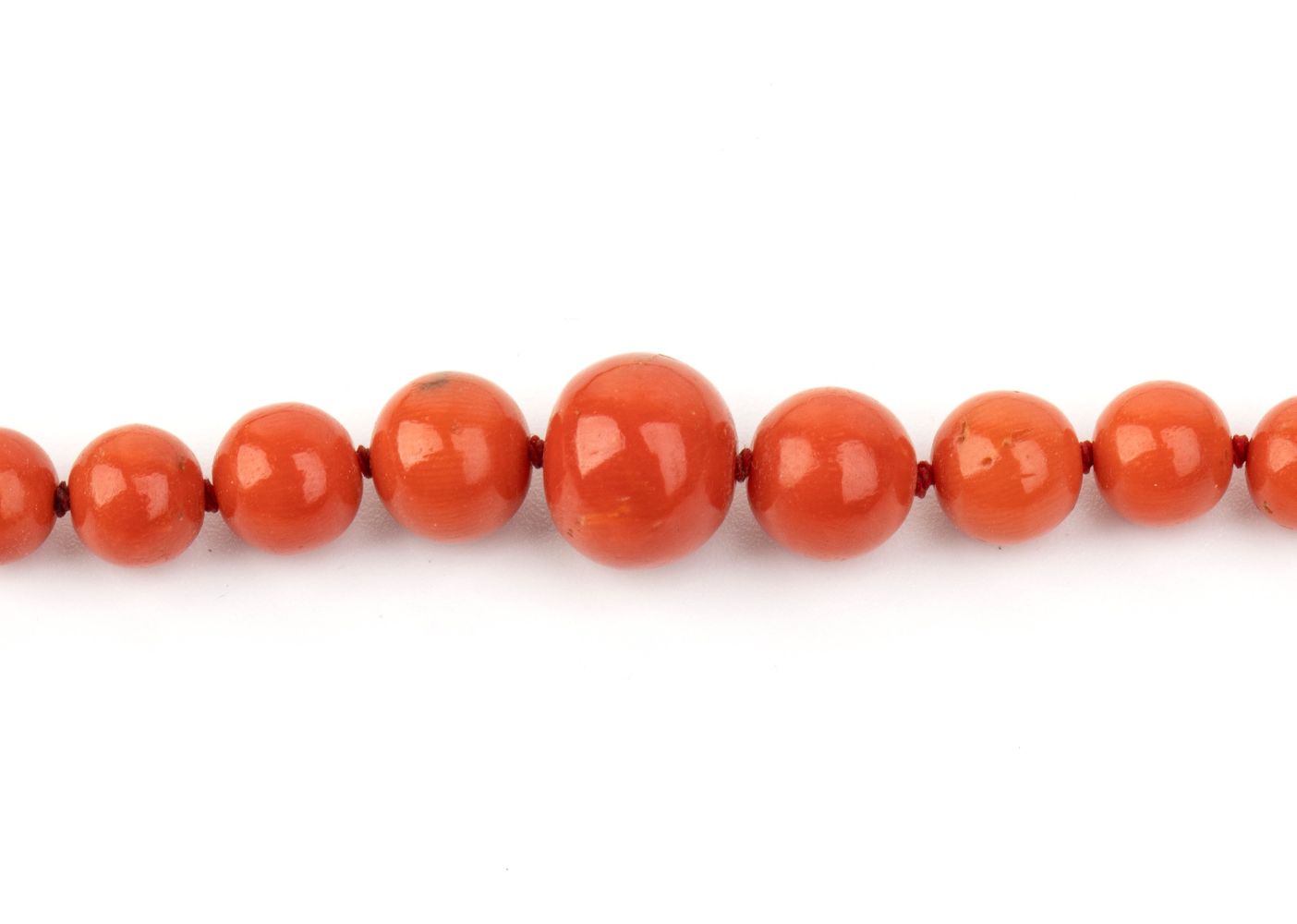 1) collana ad un filo di sfere di corallo Mediterraneo (corallium rubrum) disposte in gradazione, chiusura in oro giallo 18k. Punzonata "750". Diametro sfere 11-7-4.5 mm. Lunghezza 60 cm. Peso 28.9 gr.