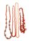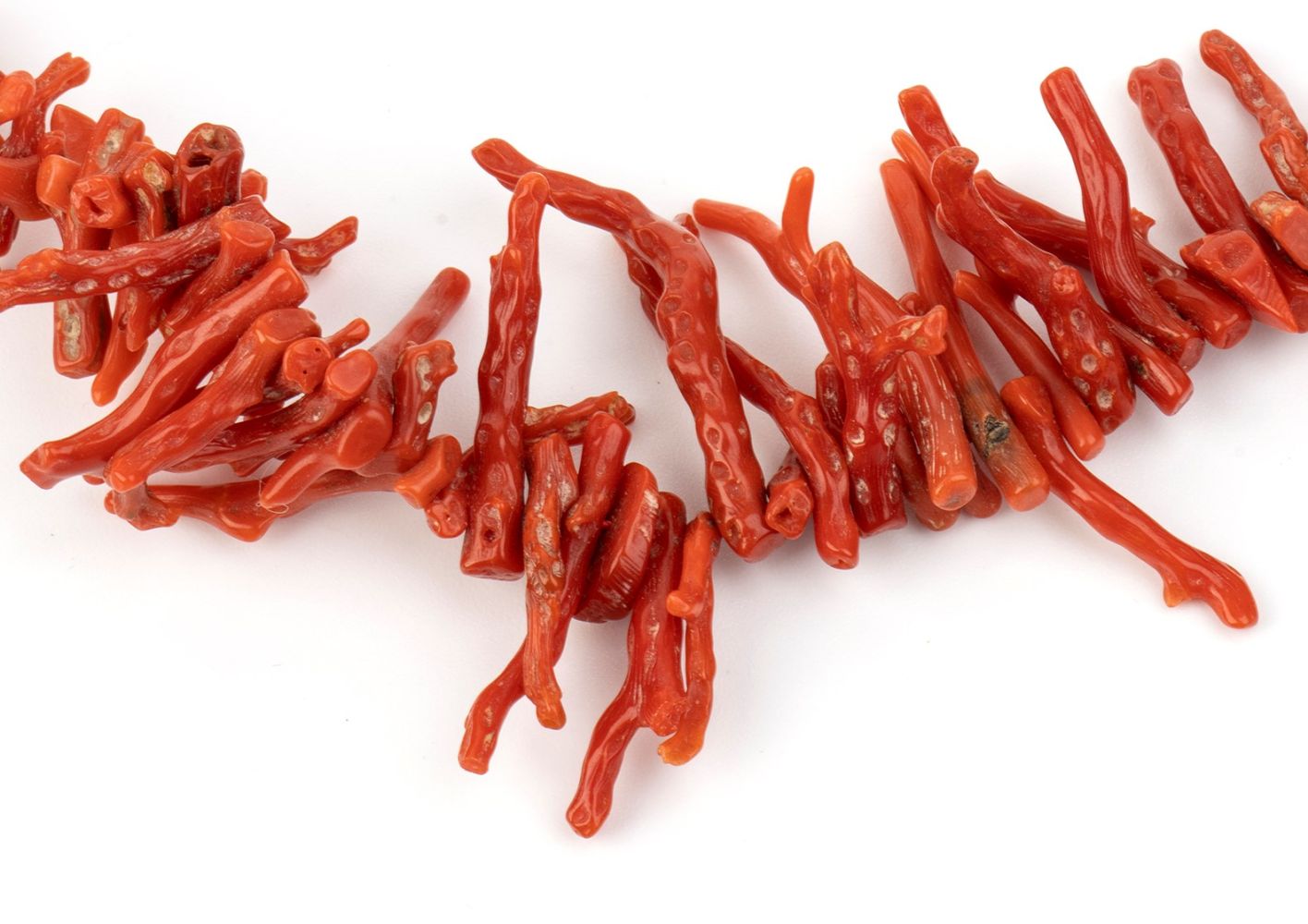 3) collana ad un filo di rametti di corallo Mediterraneo (corallium rubrum), chiusura in oro giallo. Punzonata "750". Lunghezza 48 cm. Peso 47.1 gr.