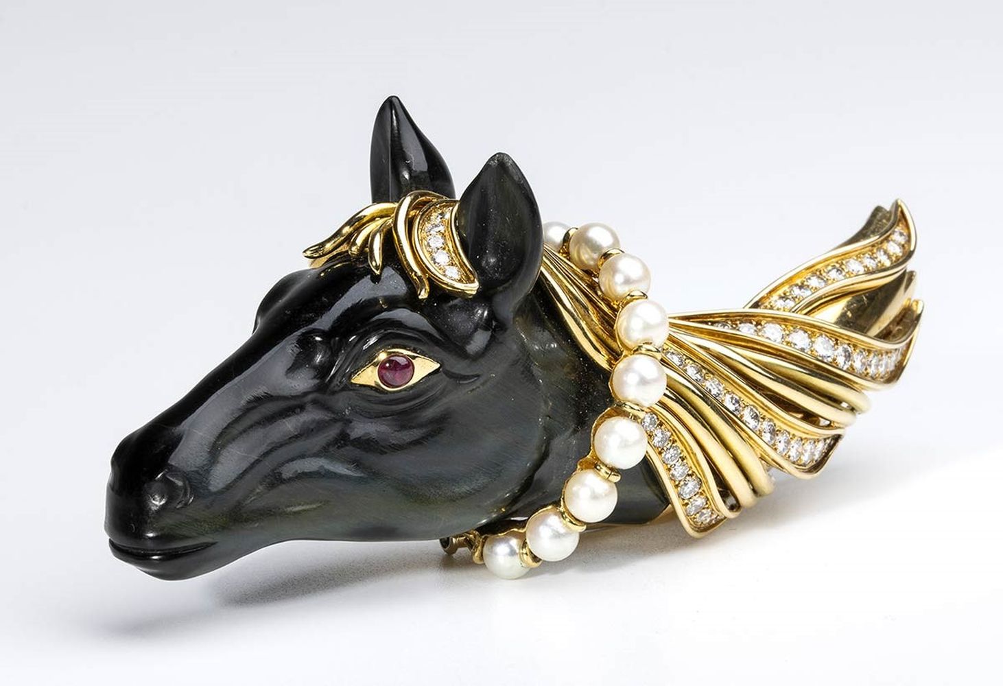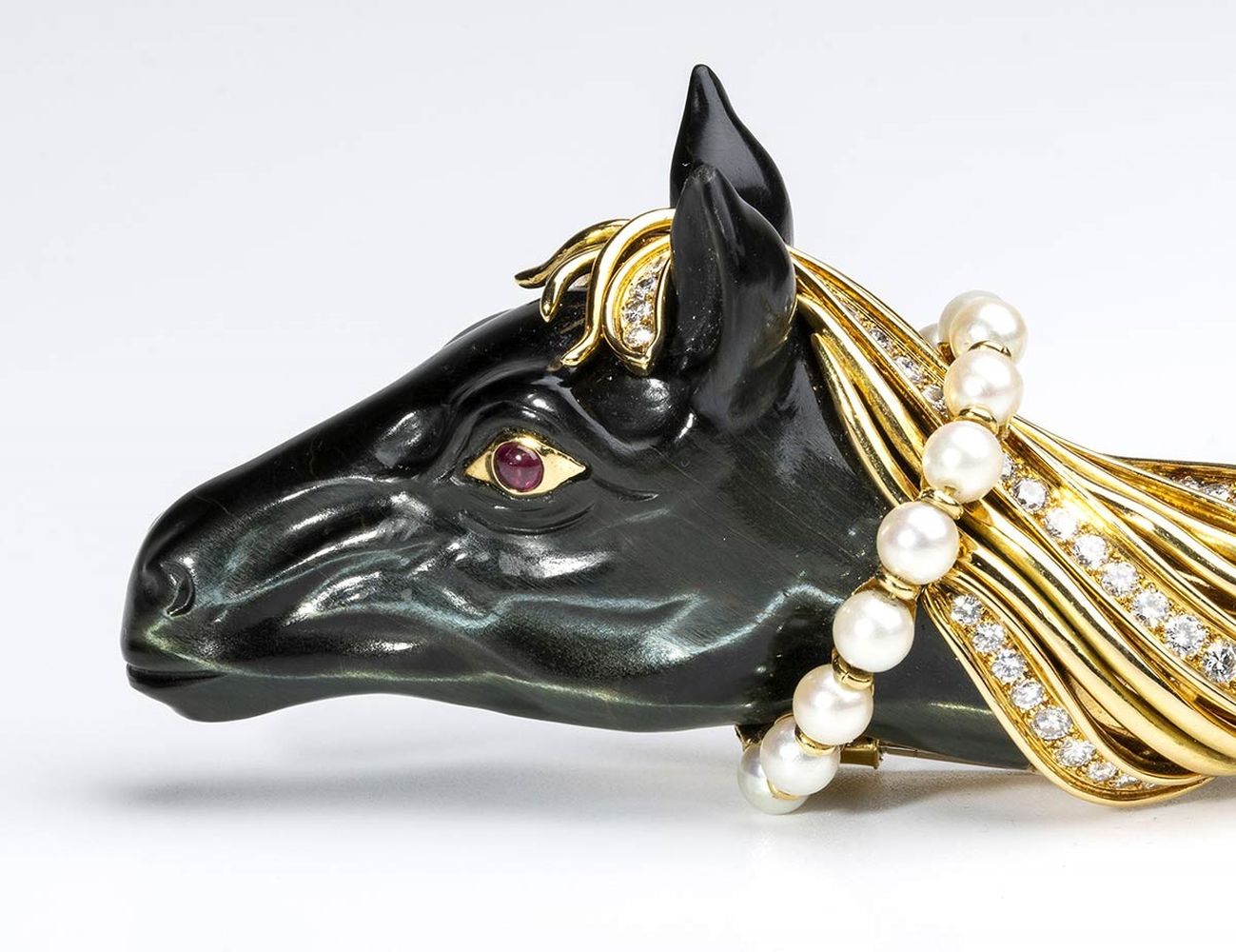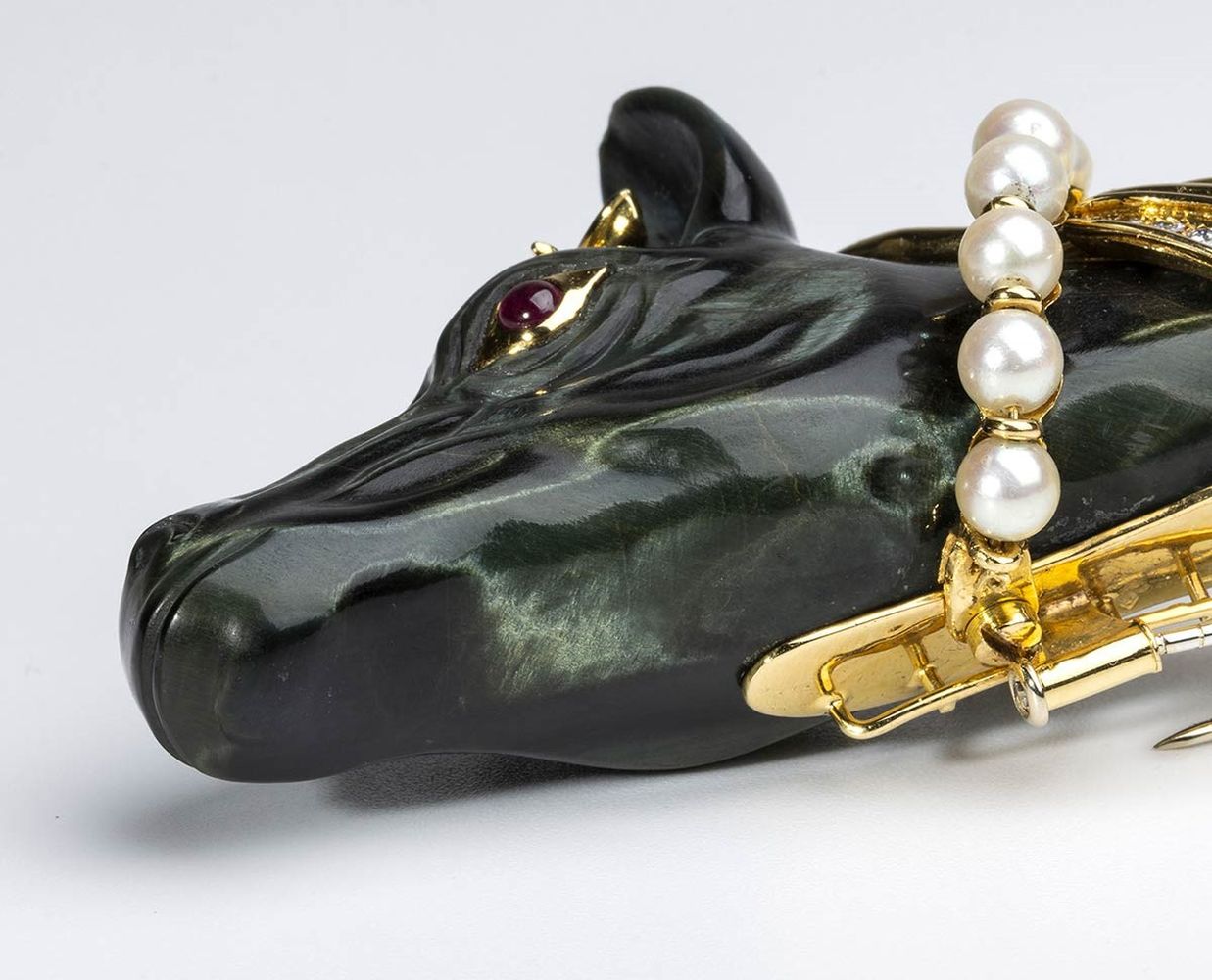 raffigurante una testa di cavallo realizzata in crisoberillo gatteggiante scolpito, criniera in oro giallo 18k impreziosita da diamanti taglio brillante 2,60 ct circa, G, VVS-VS, occhi in piccoli rubini, collana di perle coltivate d'acqua salata al collo del cavallo.