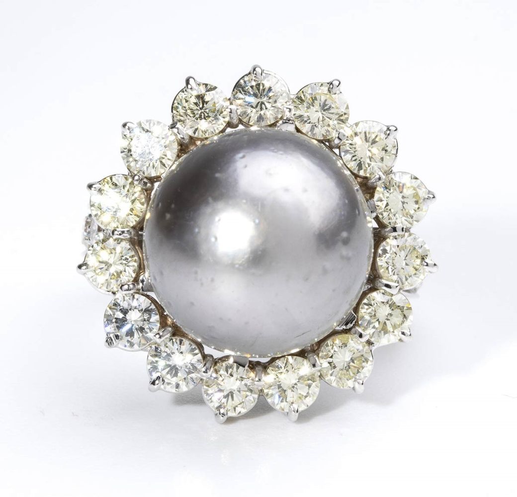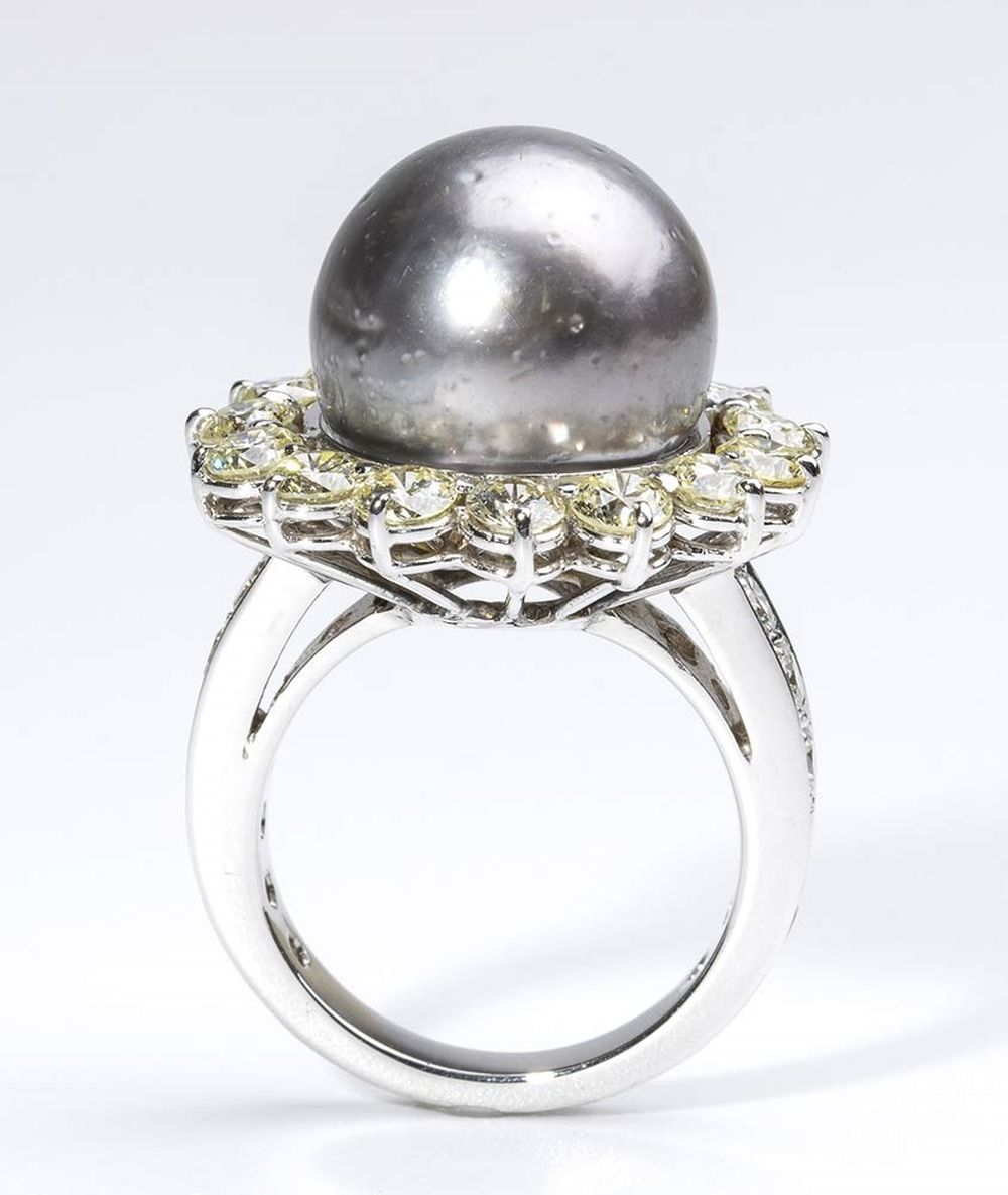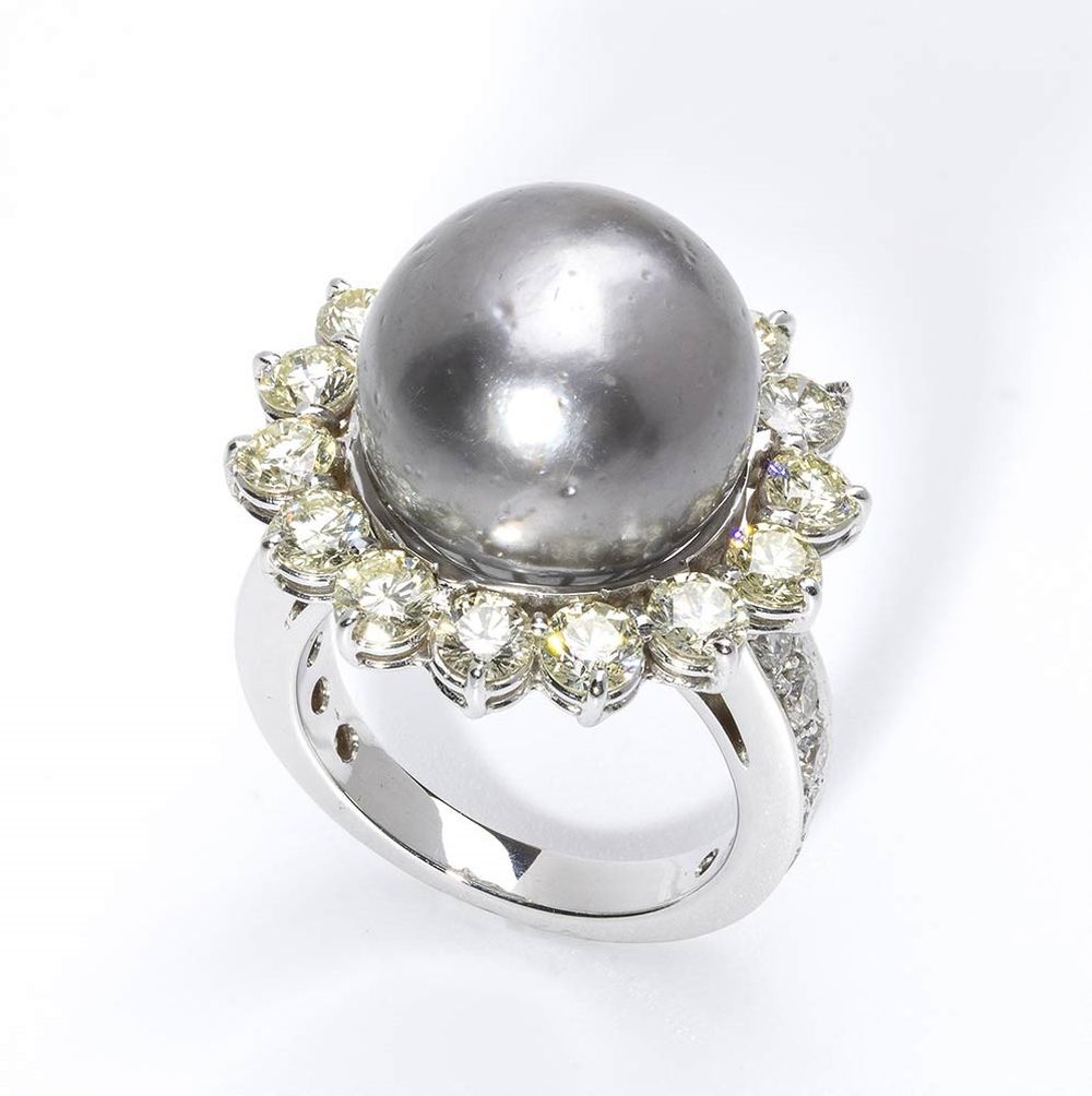 oro bianco 18k, con perla Tahiti incorniciata da diamanti colore fantasia giallo e diamanti incolori.