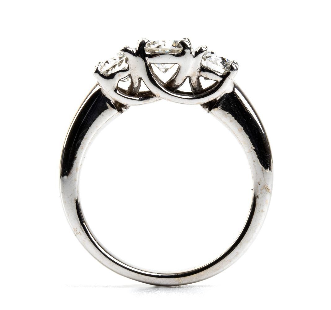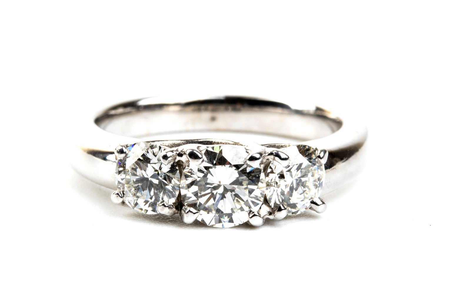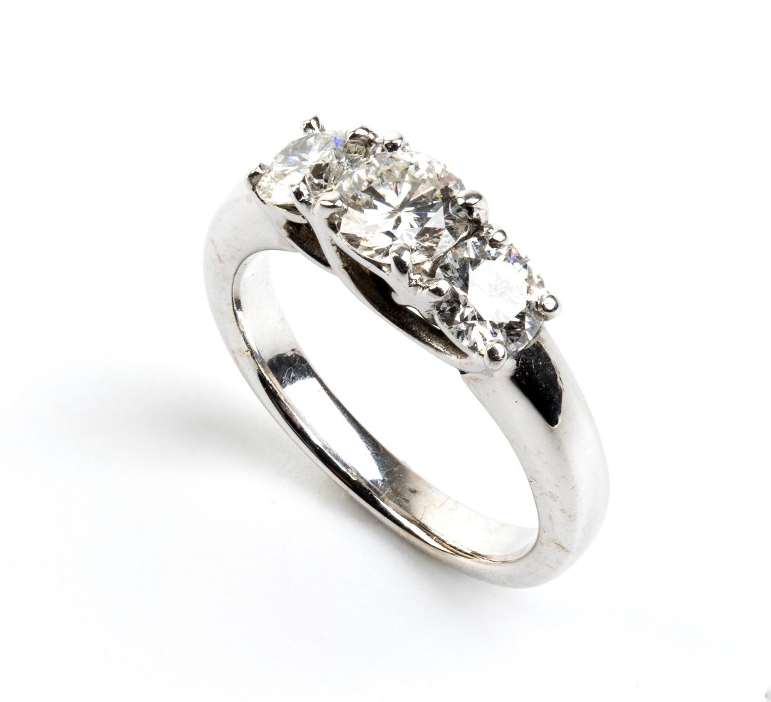 oro bianco 18k, incastonato con 3 diamanti di forma rotonda taglio brillante 0,65 ct + 0,40 ct + 0.40 ct, circa, F-G, VVS.