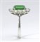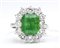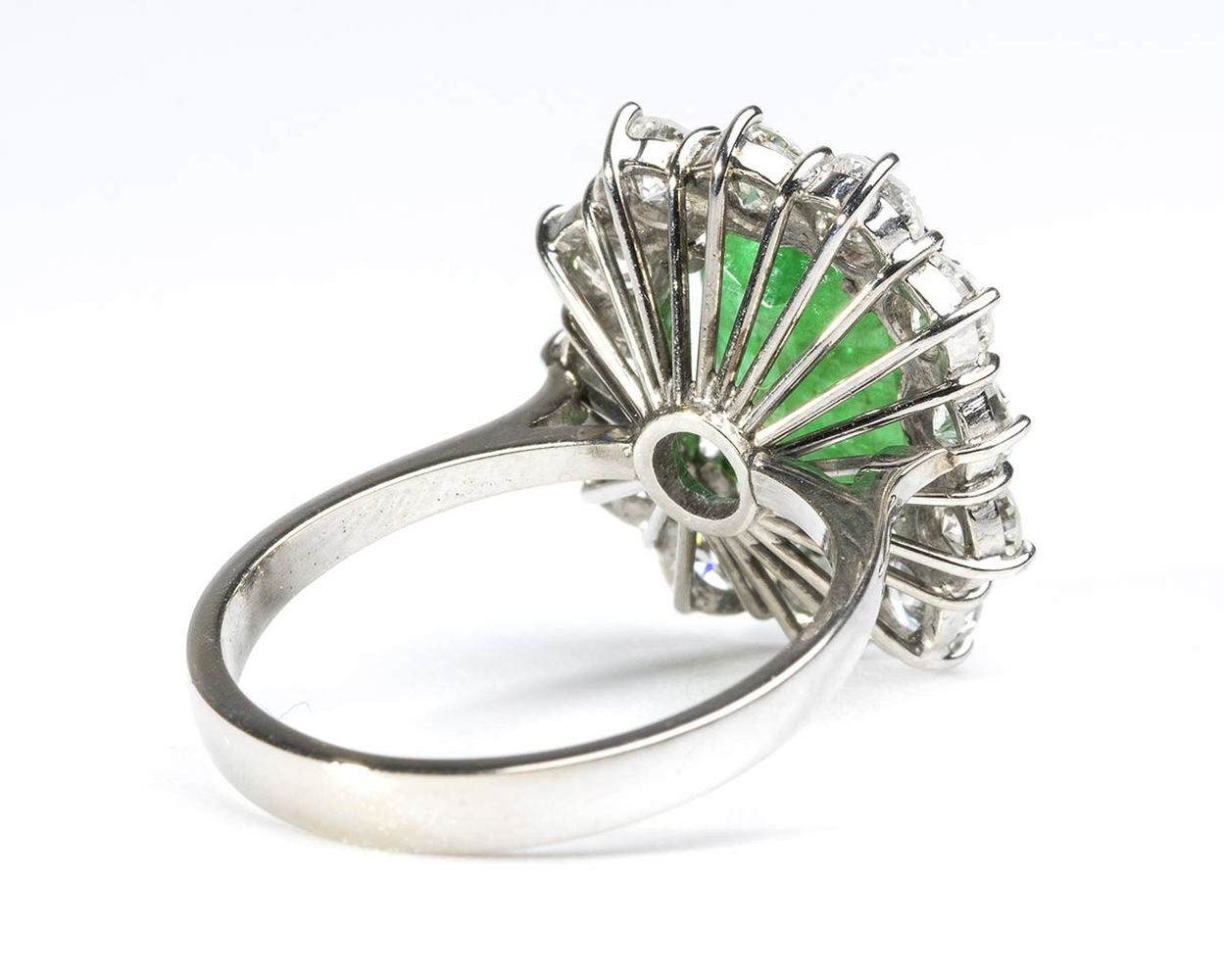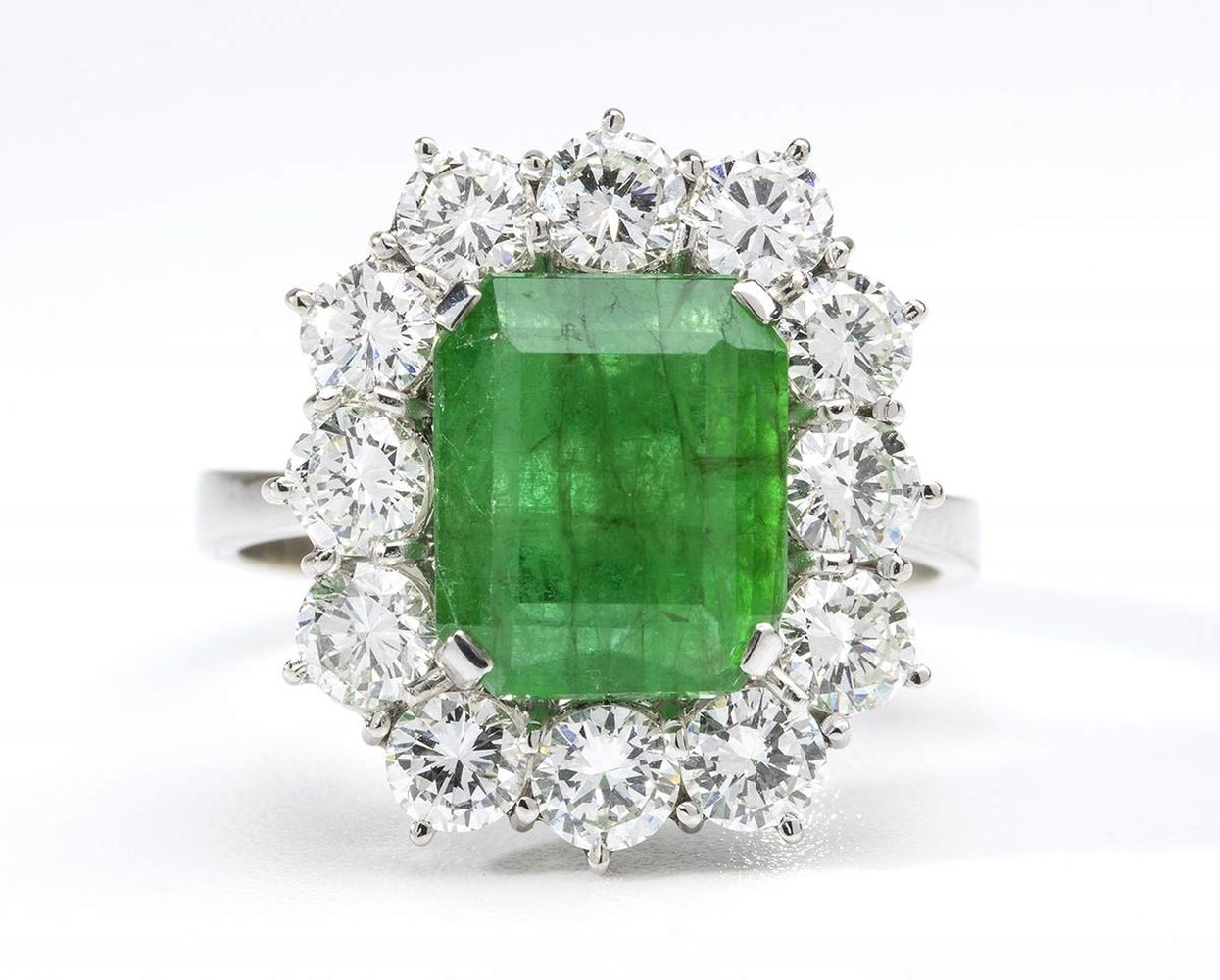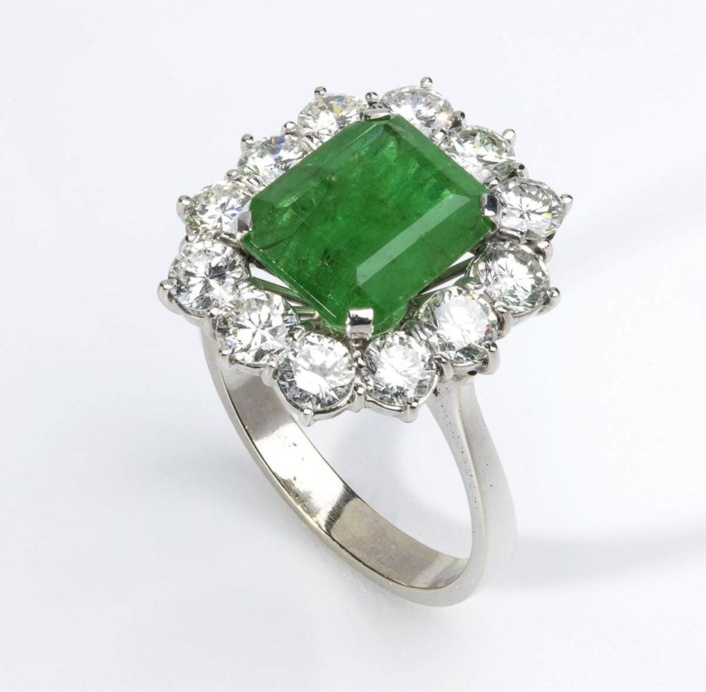 oro bianco 18k, incastonato con smeraldo incorniciato da diamanti. Smeraldo di forma ottagonale taglio a gradini 4.00 ct circa. Diamanti di forma rotonda taglio brillante 2.20 ct circa, F-G, IF-VVS.