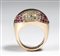 oro rosa 18k, incastonato con pave' di diamanti e rubini. Diamanti di forma rotonda taglio brillante 2.00 ct circa, F-G, IF-VVS. Rubini di forma rotonda taglio composito 2.80 ct circa. Punzonato "750".