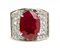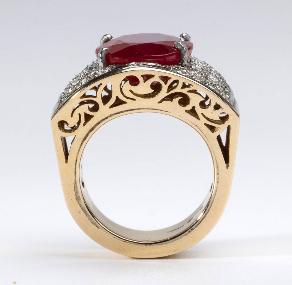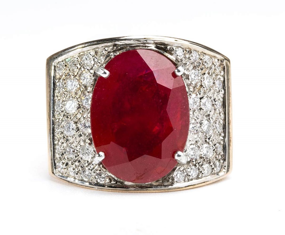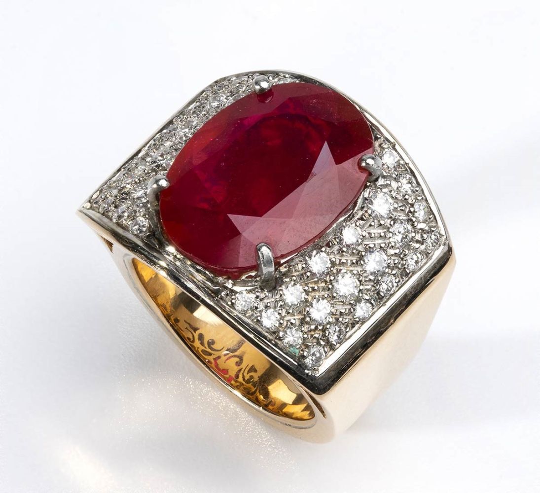 oro bianco e giallo 18k. Rubino di forma ovale taglio composito 13.00 ct circa. (trattamento di riempimento con vetro al piombo). Diamanti di forma rotonda taglio brillante 1.30 ct circa, H, VS-SI. Punzonato "750 - 12 NA".