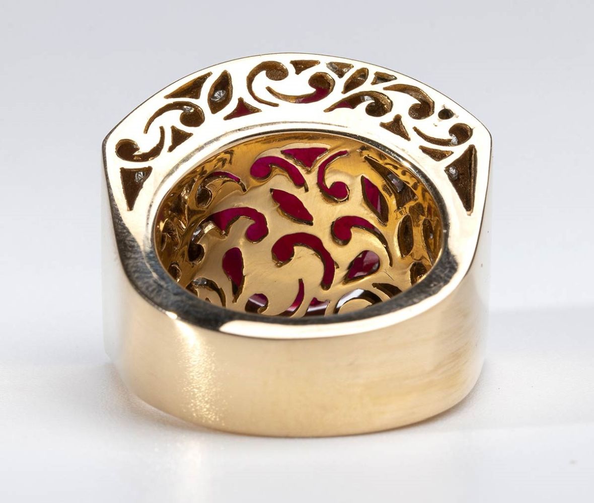 Anello a fascia con rubino con vetro al piombo e pavè di diamanti