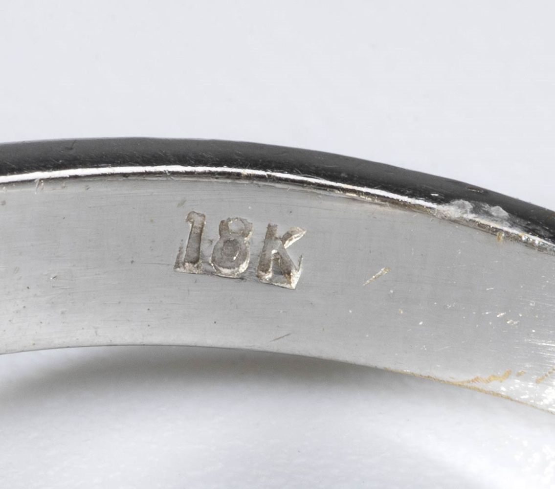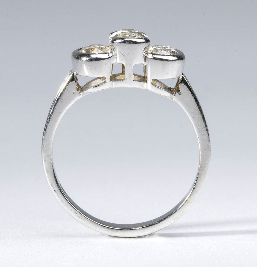 oro bianco 18k, incastonato con tre diamanti. N. 3 diamanti di forma ovale taglio brillante modificato, rispettivamente 0.55 ct, 0.43 ct e 0.45 ct circa, J-K, VVS. Punzonato "18k".