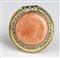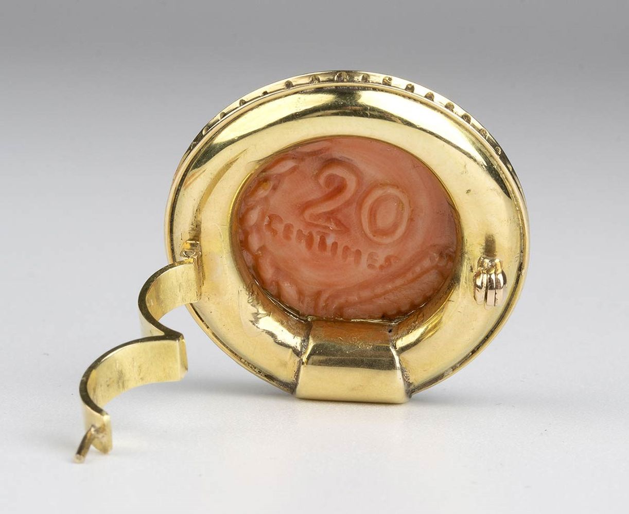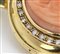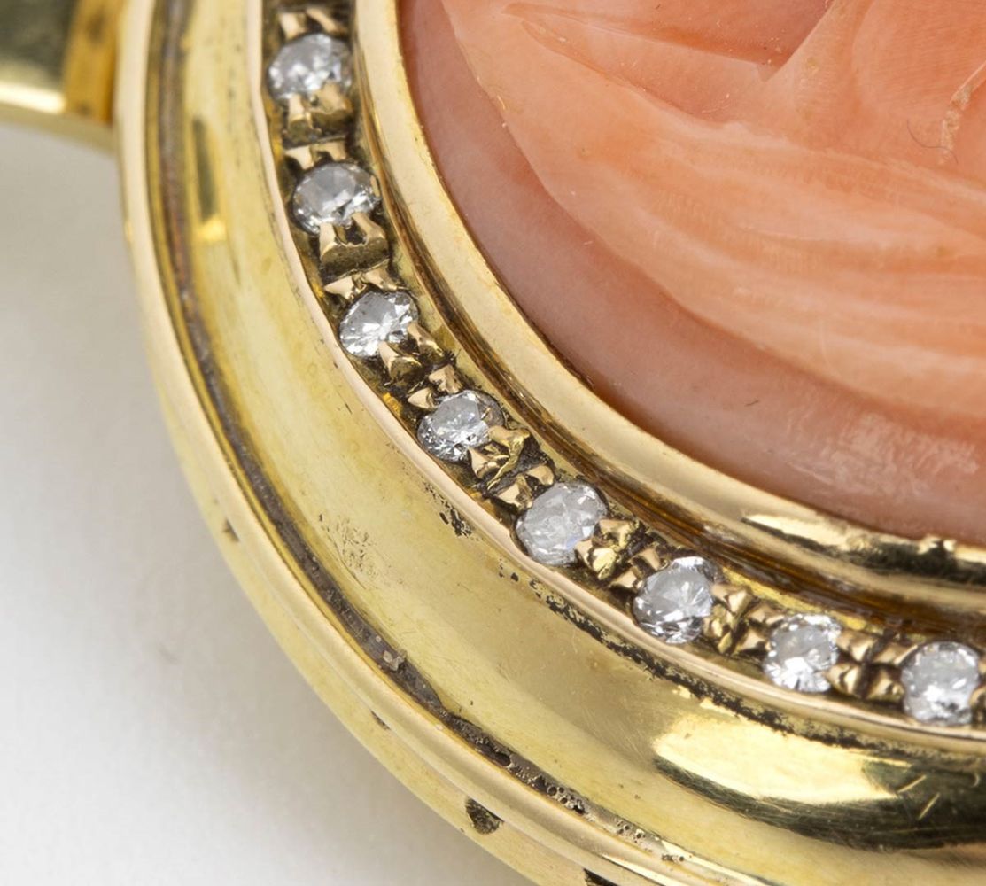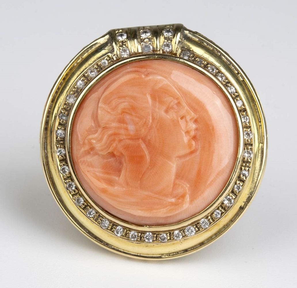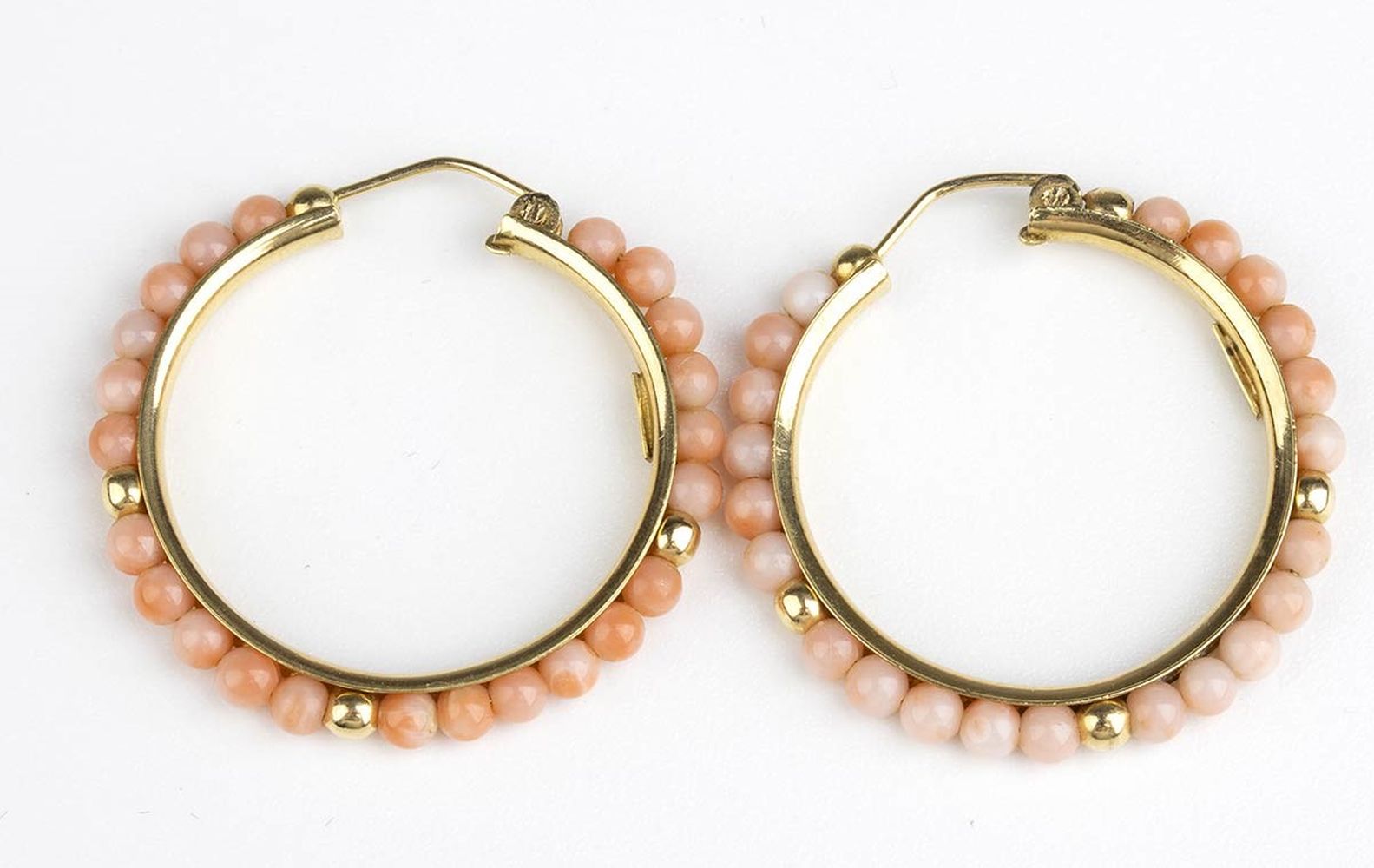 oro giallo 18k, piccole sfere di corallo rosa (corallium regale), dettagli in diamanti. Diamanti di forma rotonda, taglio brillante 0.50 ct circa. Punzonato "750 - 337 NA".