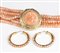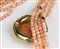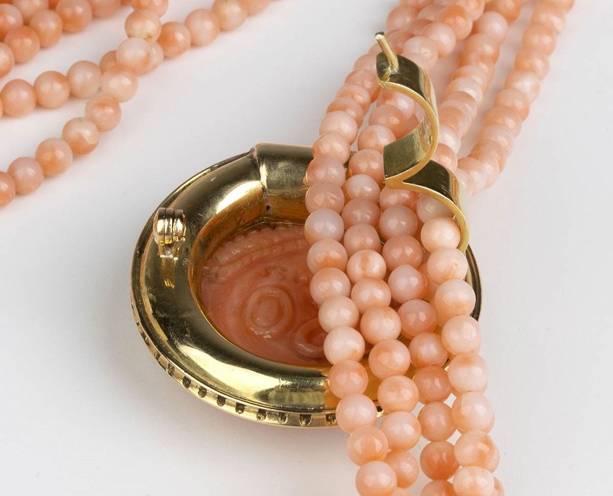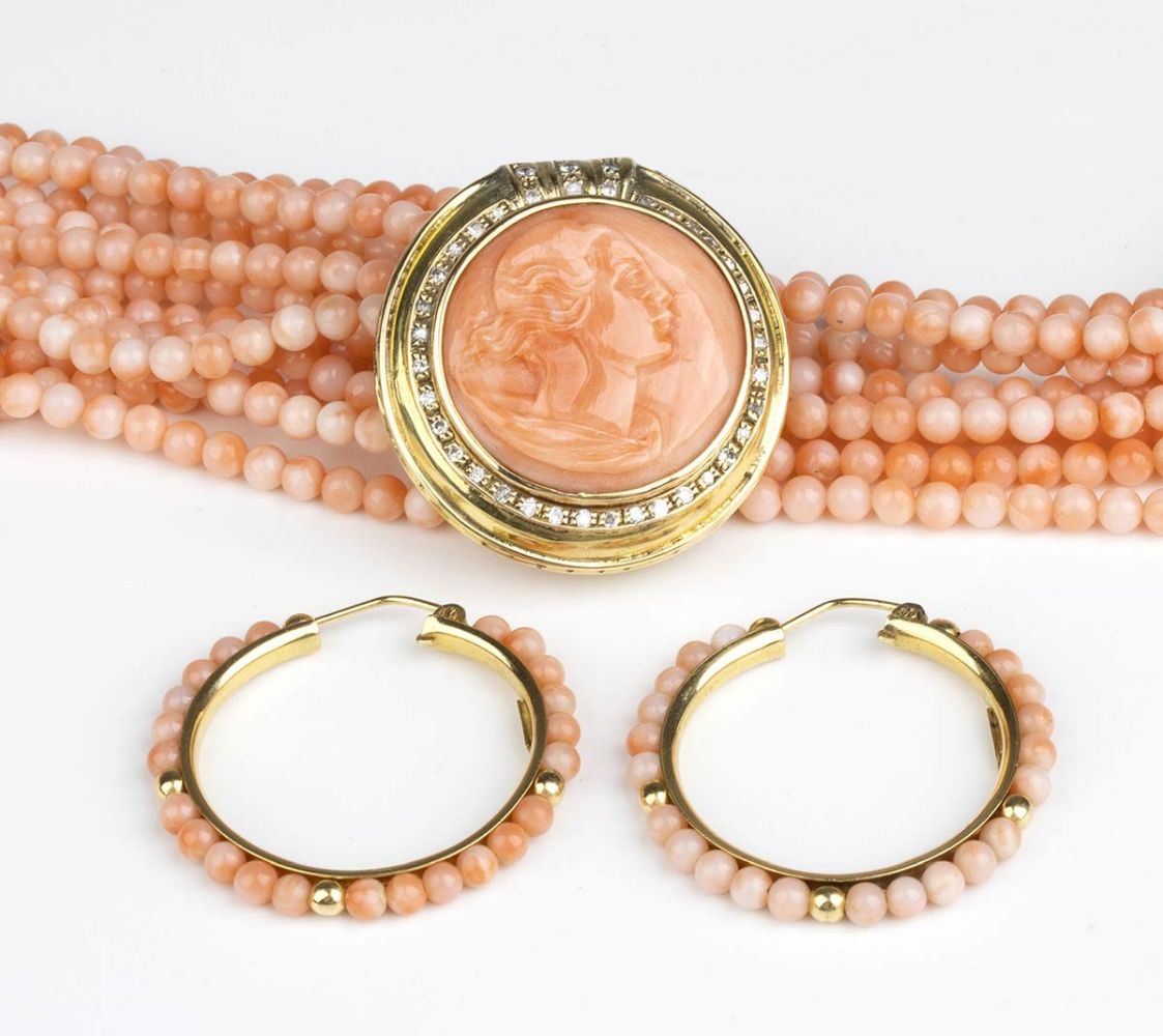 Paio di orecchini e girocollo a dieci fili in oro, corallo rosa e diamanti
