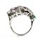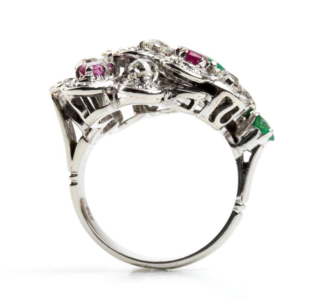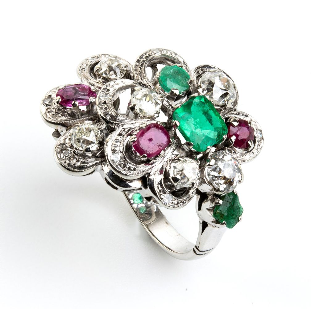 oro bianco 18k, con nastri in diamanti e punteggiature in rubini e smeraldi. N. 06 diamanti di forma rotonda taglio vecchio europeo 1.50 ct circa, F-G, VVS-VS. N. 10 diamanti di forma rotonda taglio huit-huit 0.15 ct circa, F-G, VVS-VS. N. 03 smeraldi forme e tagli vari 1.60 ct circa. N. 03 rubini di forme e tagli vari 0.80 ct circa. Punzonato "18k".