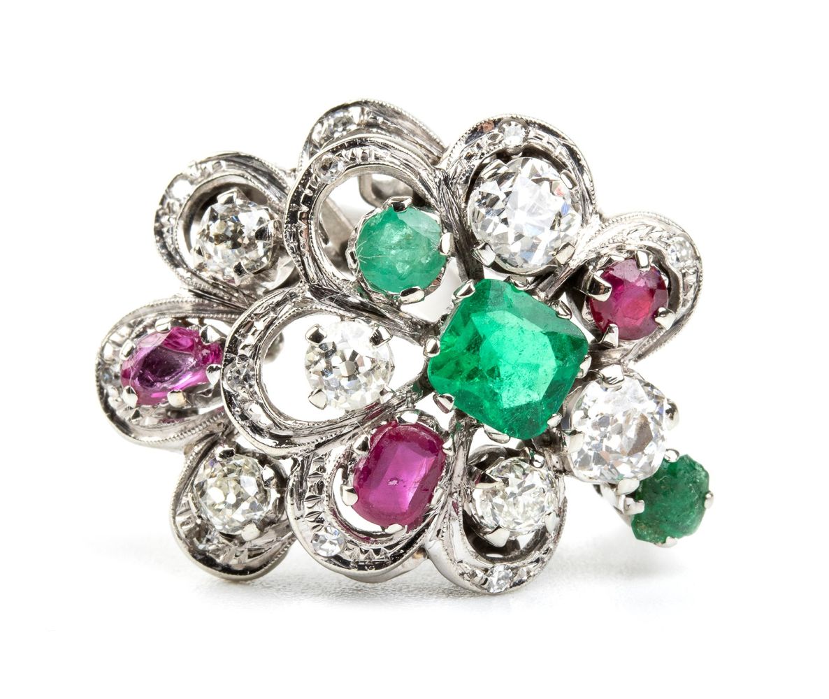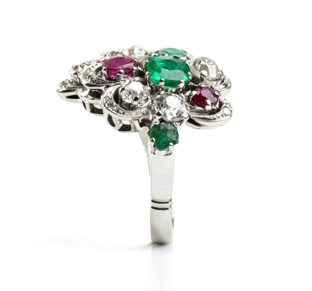Anello floreale in oro con rubini, smeraldi e diamanti