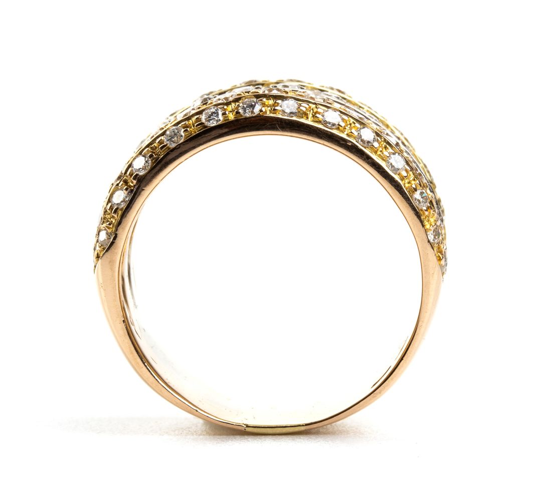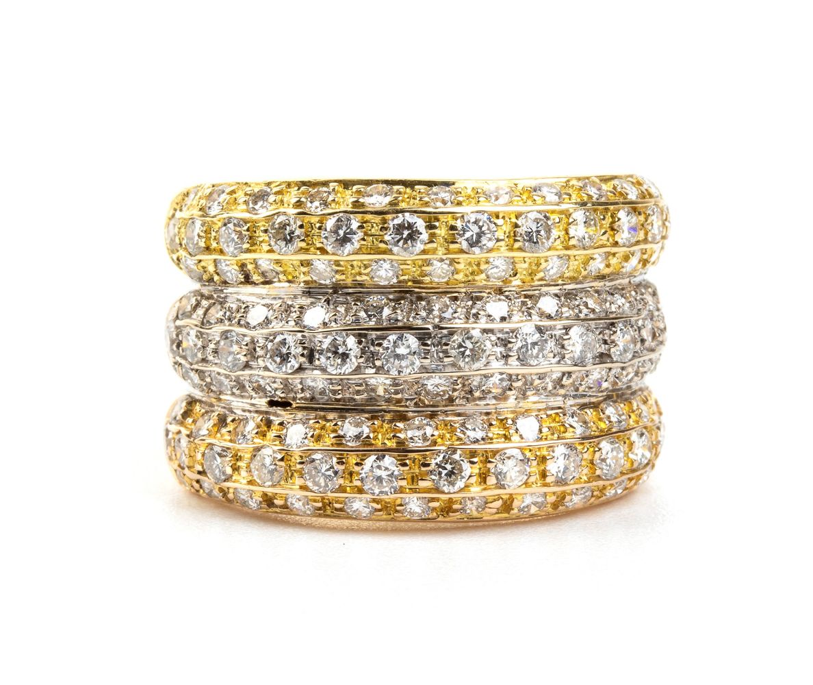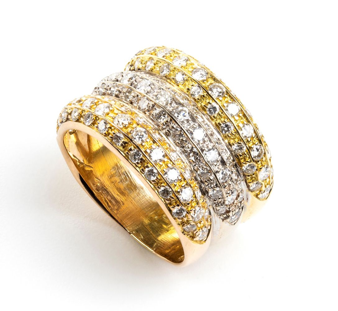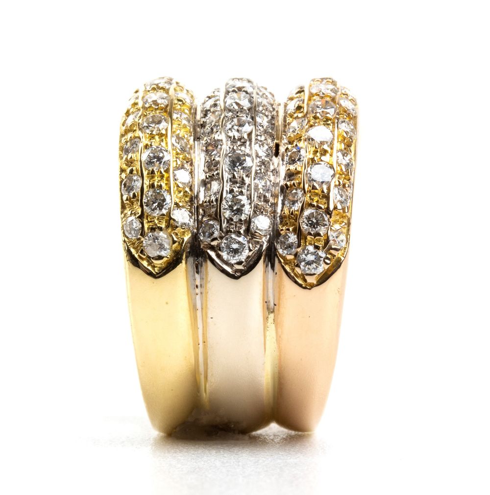 oro giallo, rosa e bianco 18k, modellato come una fascia con pave' di diamanti. N. 111 diamanti di forma rotonda, taglio brillante 1.90 ct circa, F-G, VVS-VS. Punzonato "750".