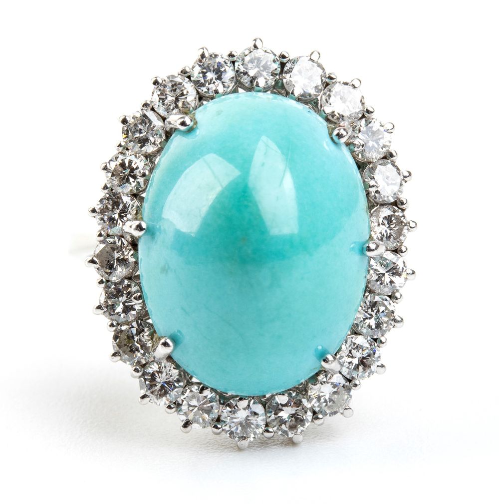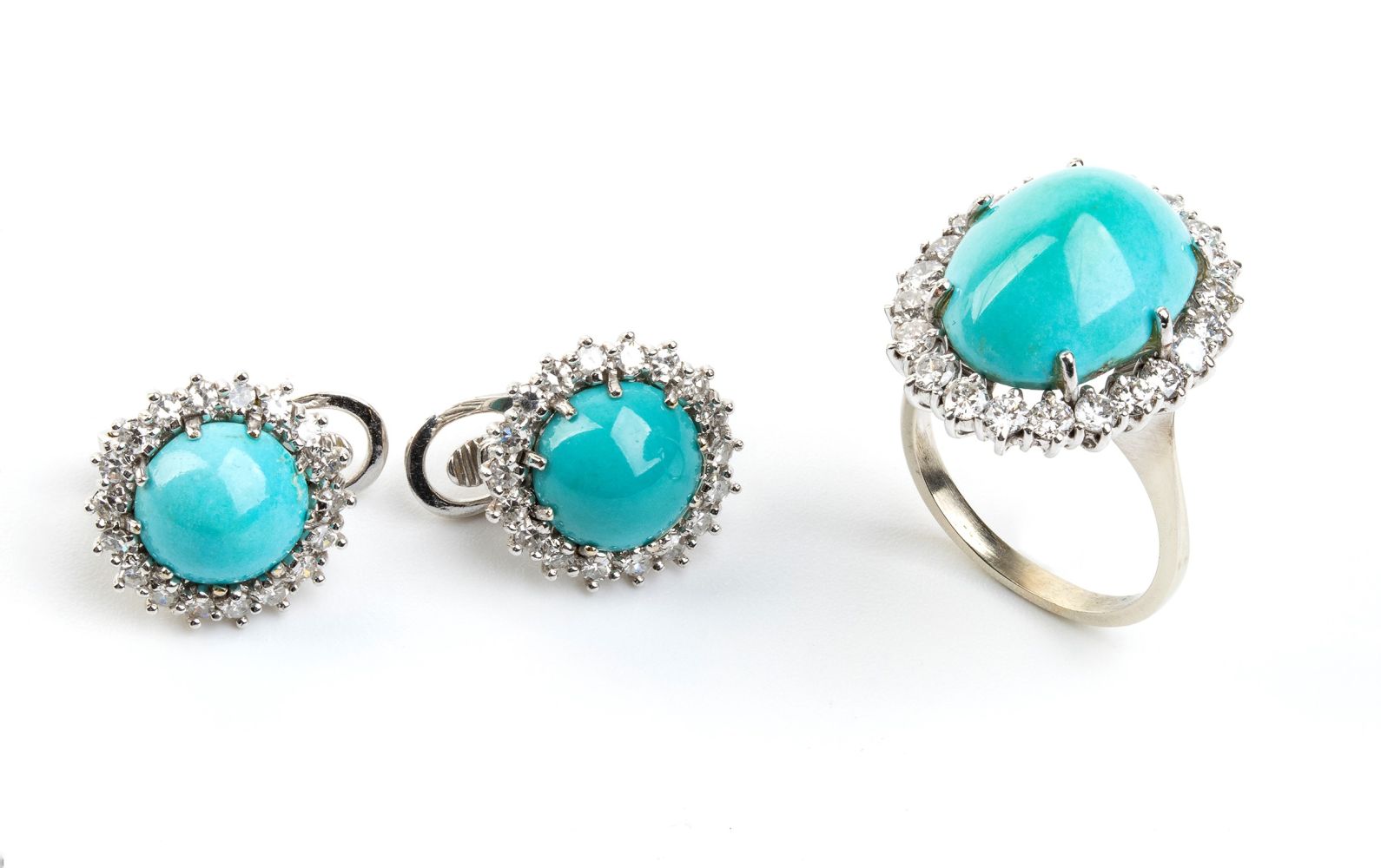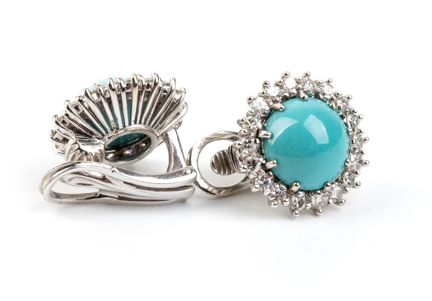 Incastonati con cabochon di turchese naturale incorniciate da diamanti. N. 23 diamanti di forma rotonda, taglio brillante + N. 360 diamanti di forma rotonda, taglio huit-huit, circa 2.20 ct totali, E-F, VVS-VS.