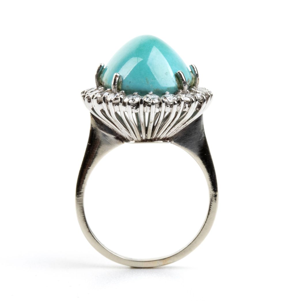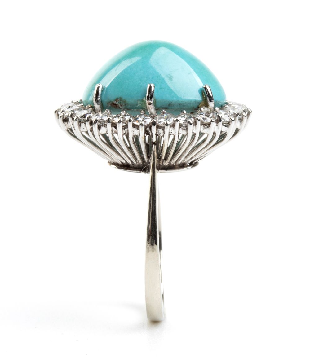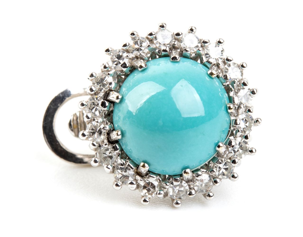 Incastonati con cabochon di turchese naturale incorniciate da diamanti. N. 23 diamanti di forma rotonda, taglio brillante + N. 360 diamanti di forma rotonda, taglio huit-huit, circa 2.20 ct totali, E-F, VVS-VS.