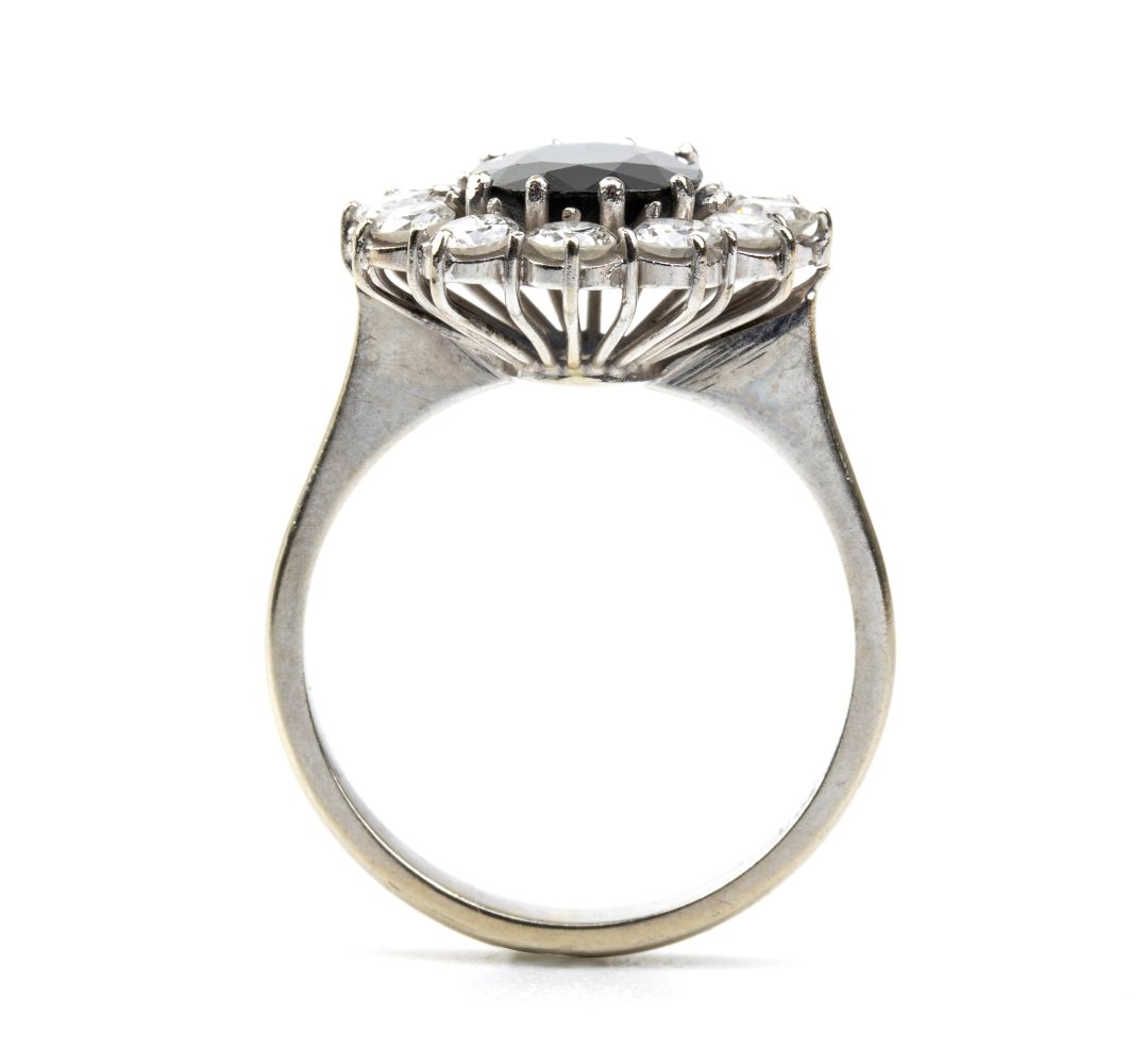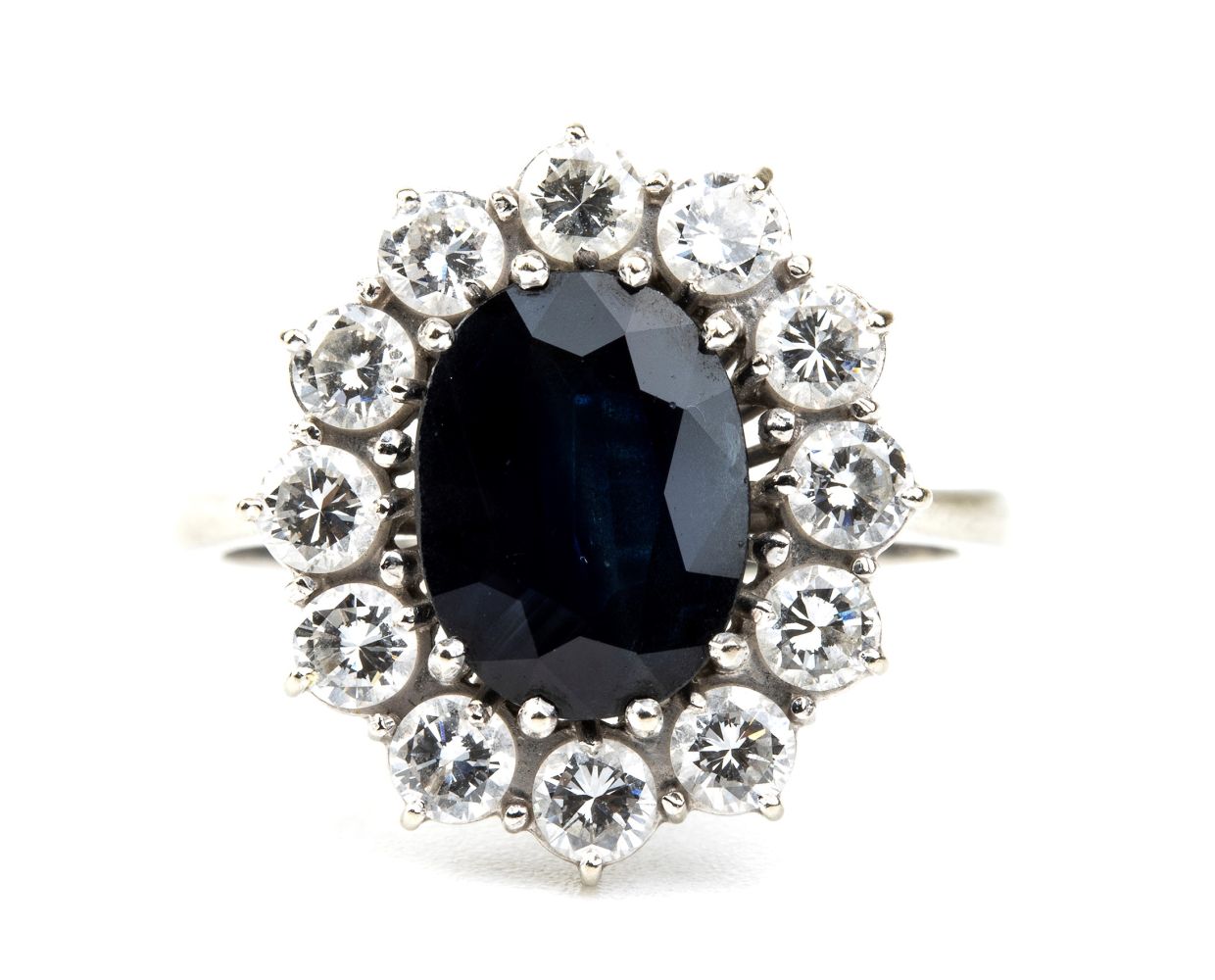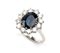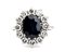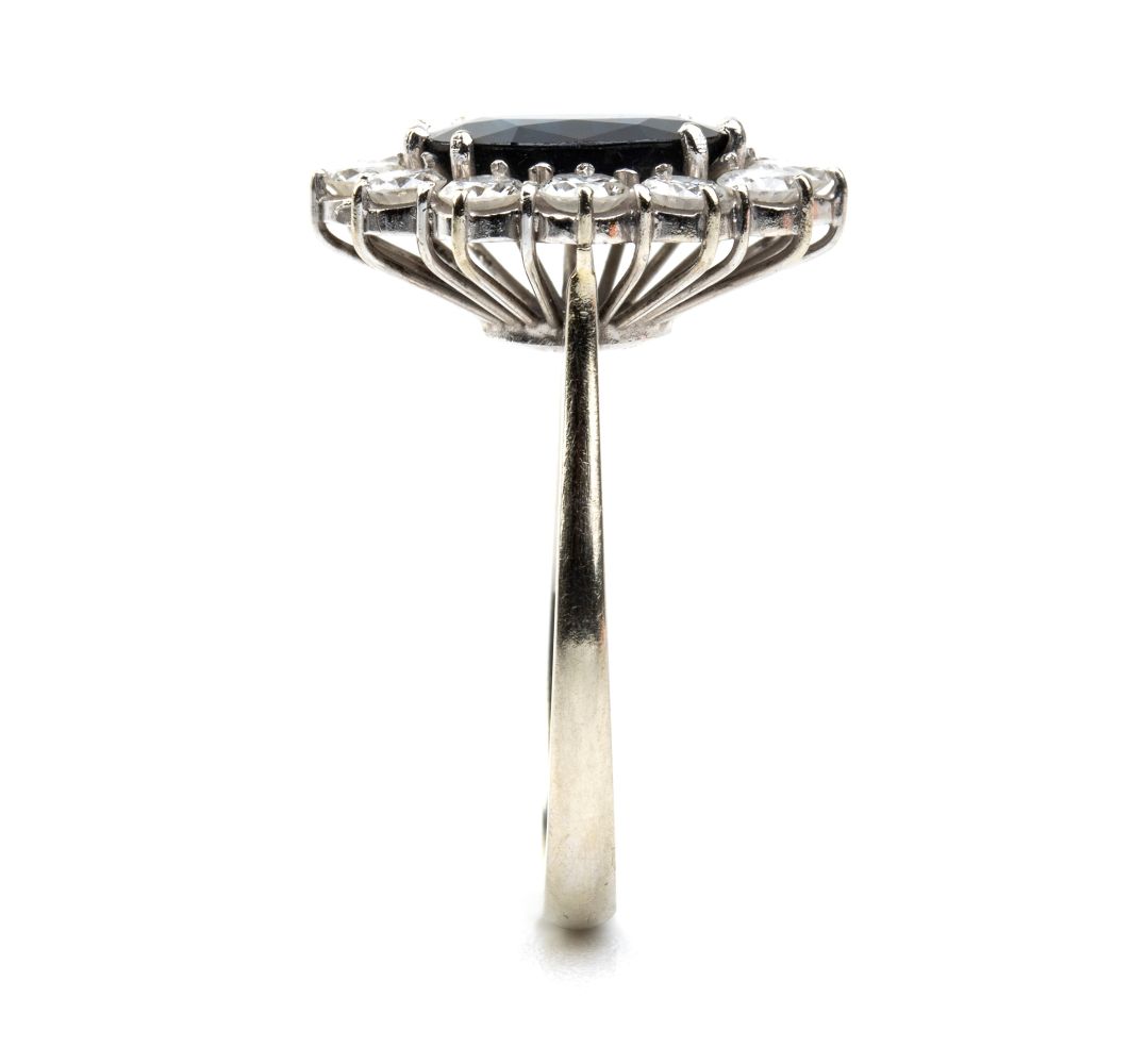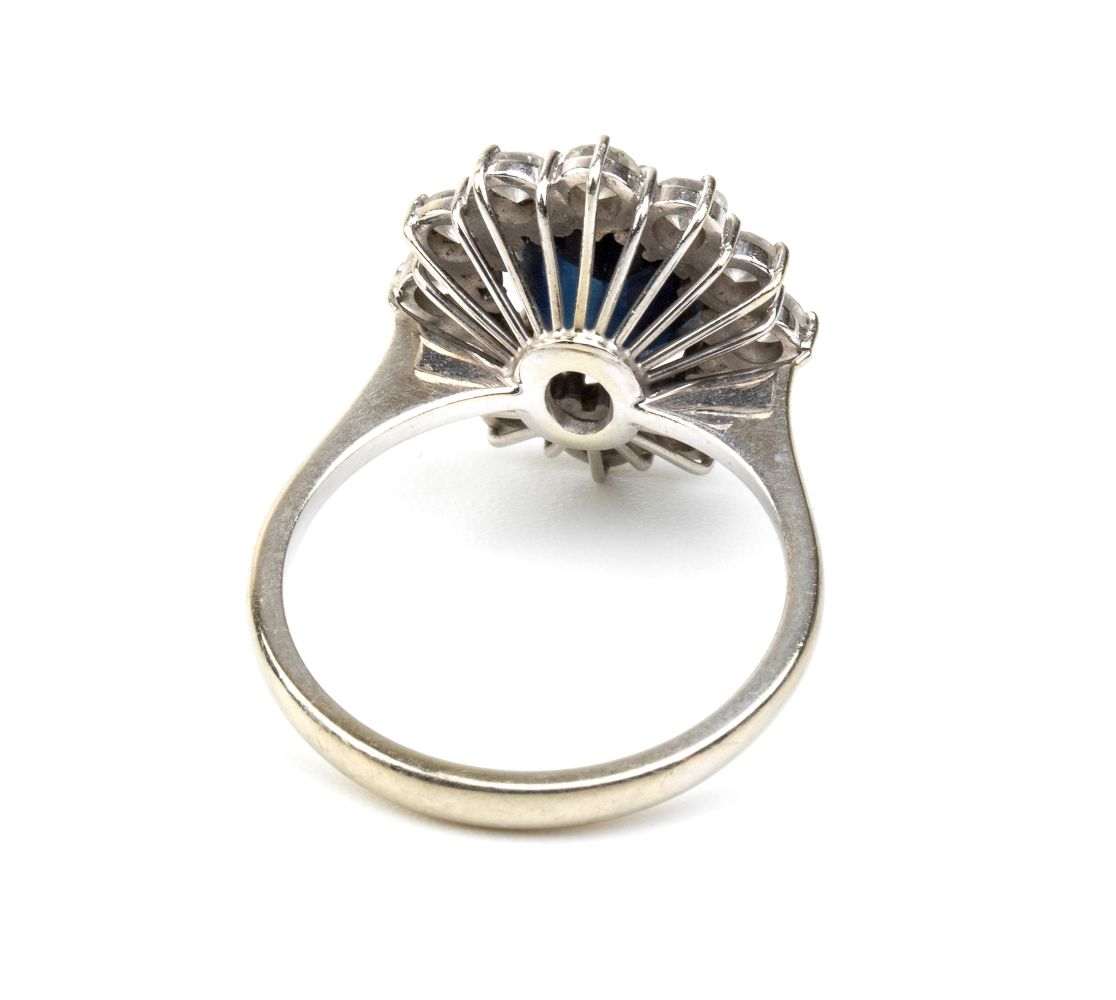 oro bianco 18k, incastonato con zaffiro incorniciato da diamanti. N. 12 diamanti di forma rotonda, taglio brillante, 1.20 ct circa, E-F, IF-VVS.