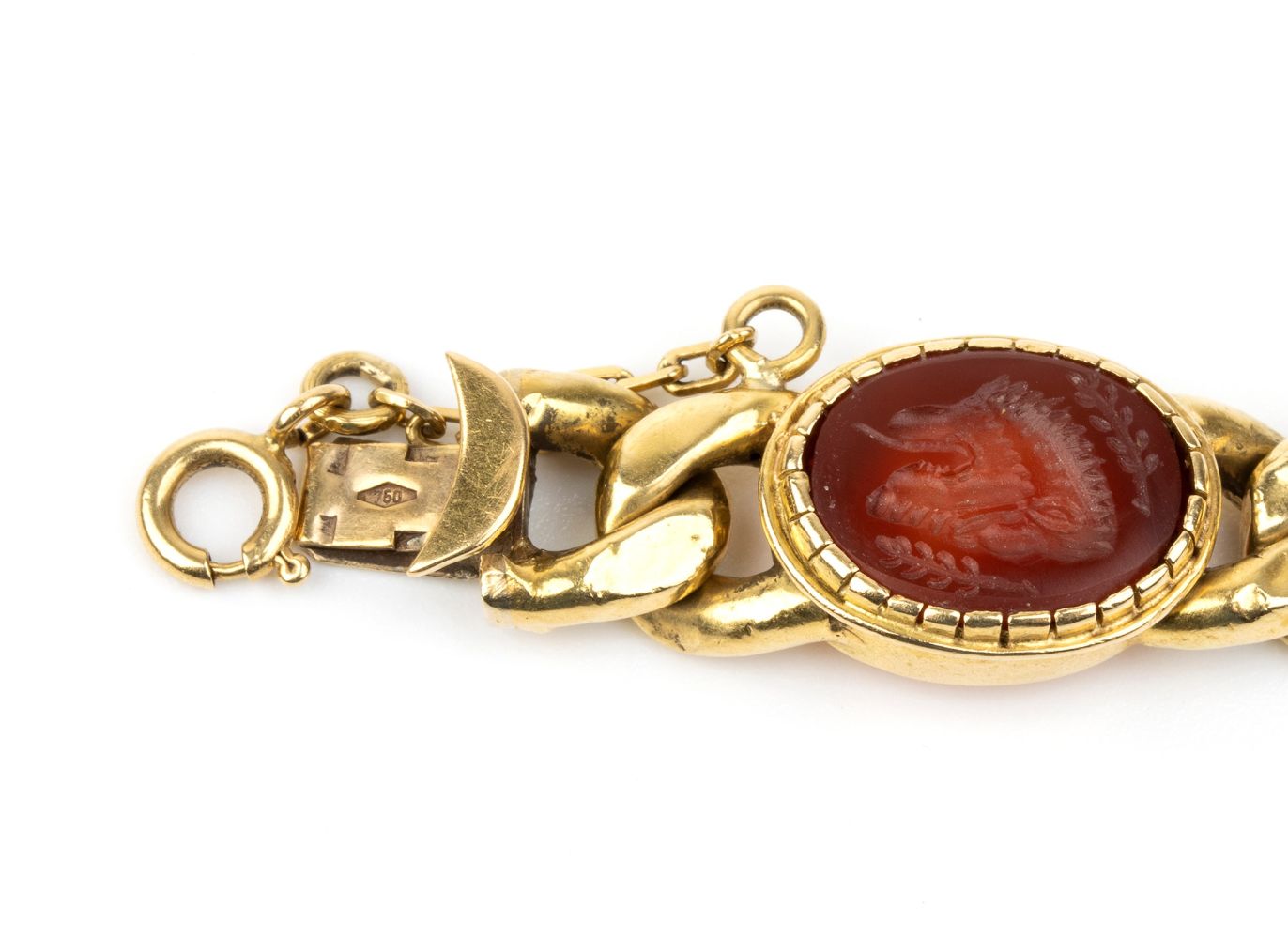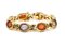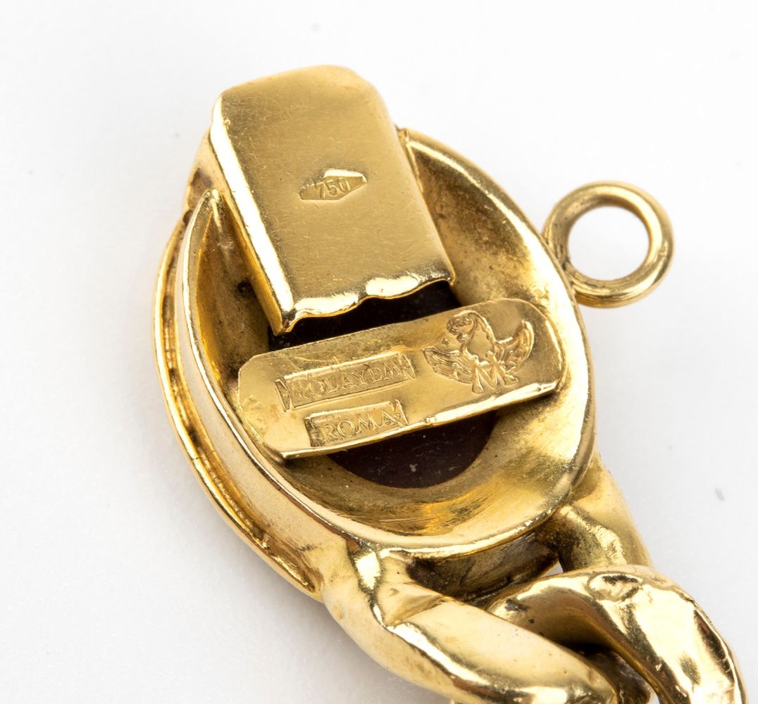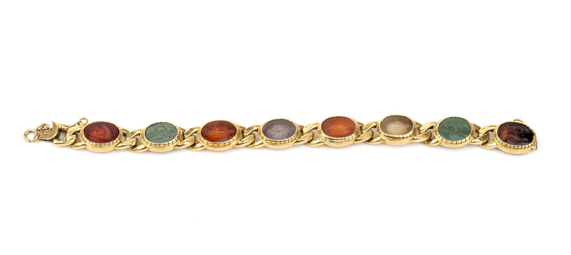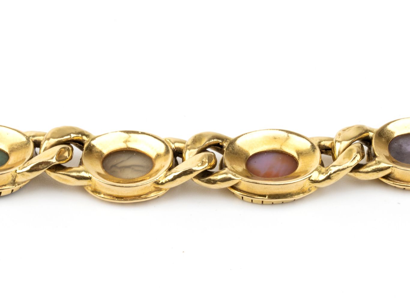oro giallo 18k, incastonato con linea di gemme di colore (1 ametista, 4 corniole, 1 quarzo citrino, 2 diaspri) incisi con motivi di ispirazione archeologica. Firmato "MOLAYEM -Roma". Punzonato "750".