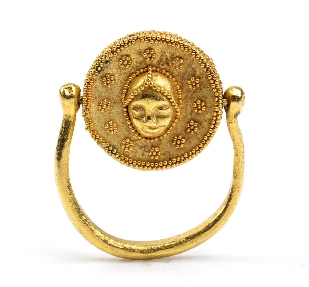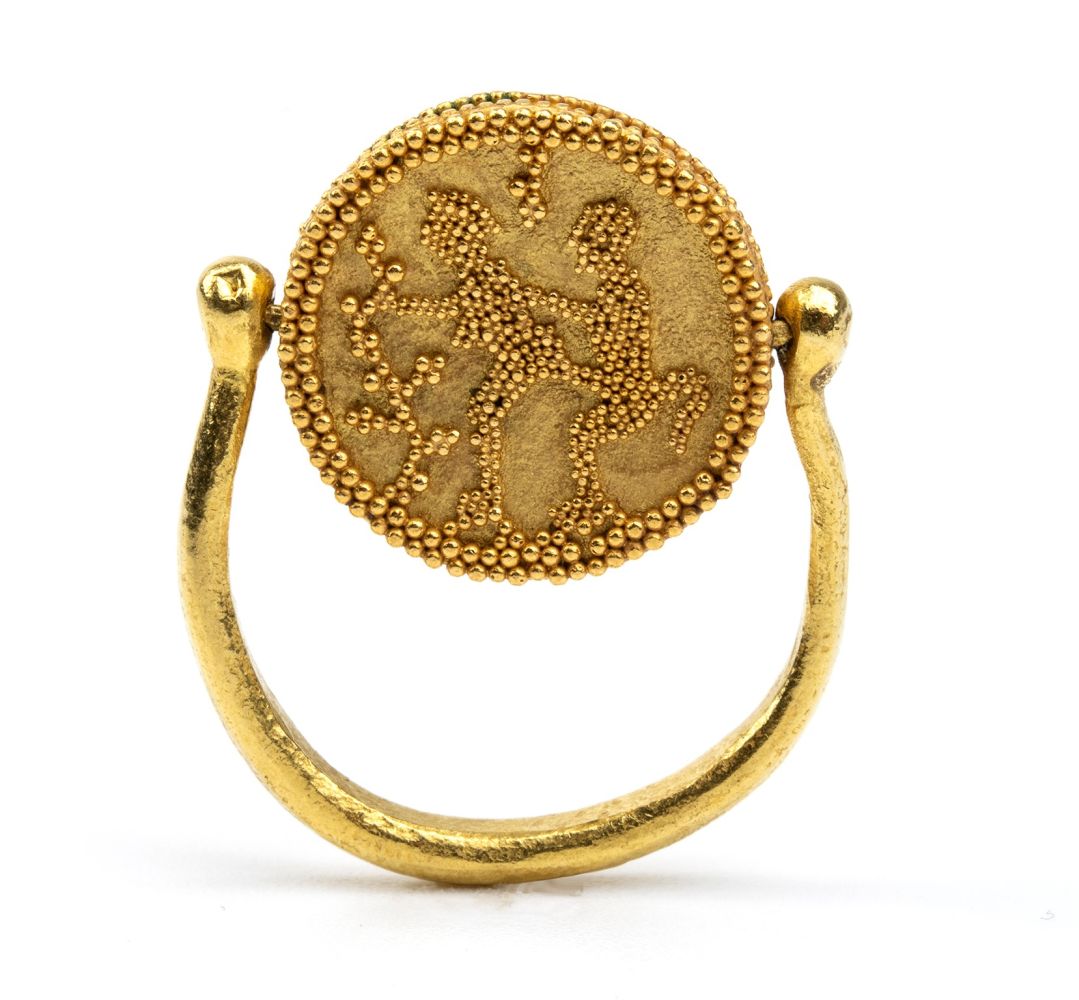 con centrale girevole raffigurante un volto su di un lato ed una scena erotica sul verso. Decori con la tecnica della micro granulazione.