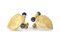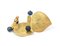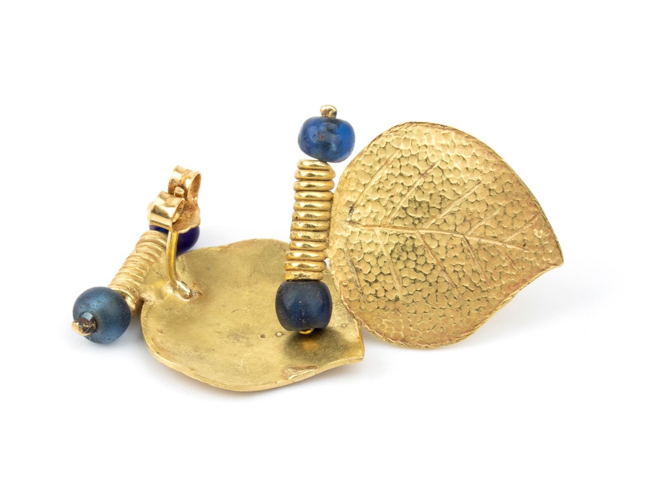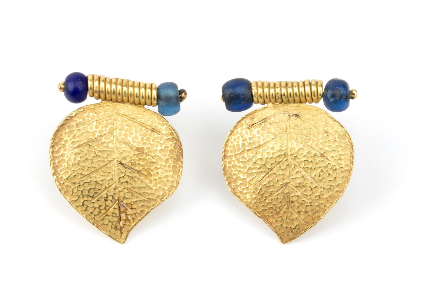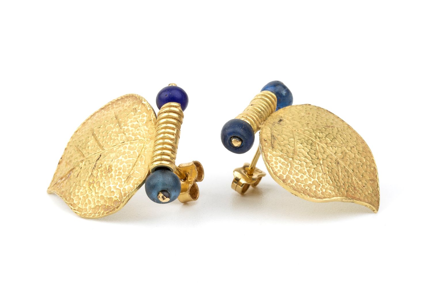 oro giallo 18k, modellati a lastra con finitura martellata, ciascuno decorato con coppia di sfere di pasta vitrea blu. Punzonati "18k".
