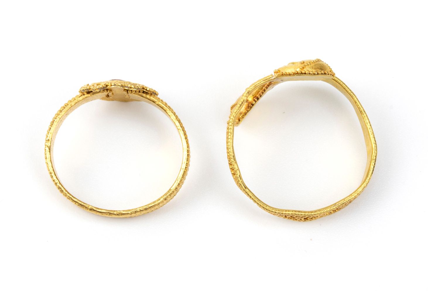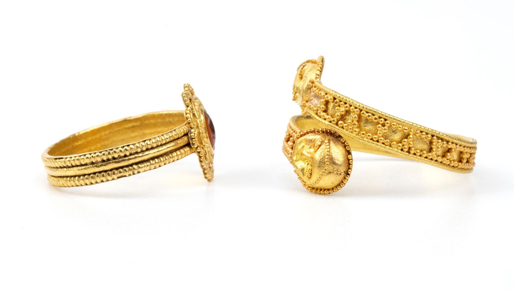 realizzati oro giallo, un anello a motivo contrarie' con piccoli volti femminili ed un anello con motivo a fiore incastonato con agata. Lavorazione a lastra, decori in filigrana e con la tecnica della micro granulazione.